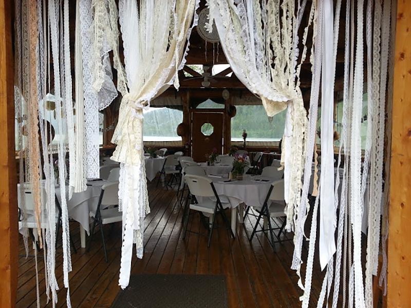 Here at Trail Lake Lodge we have a beautiful rustic lakeside burl wood pavilion with a large deck and dock looking North onto Upper Trail Lake. The East Lawn, a large grassy area is complemented by wildflowers and framed by tall trees on the lake shore, provides a perfect setting for an outdoor wedding ceremony. Our incredible Kitchen Staff is ready to provide fantastic customized appetizers and meal to match any taste and budget. The Pavilion can seat approximately 50 people comfortably for a sit down meal.