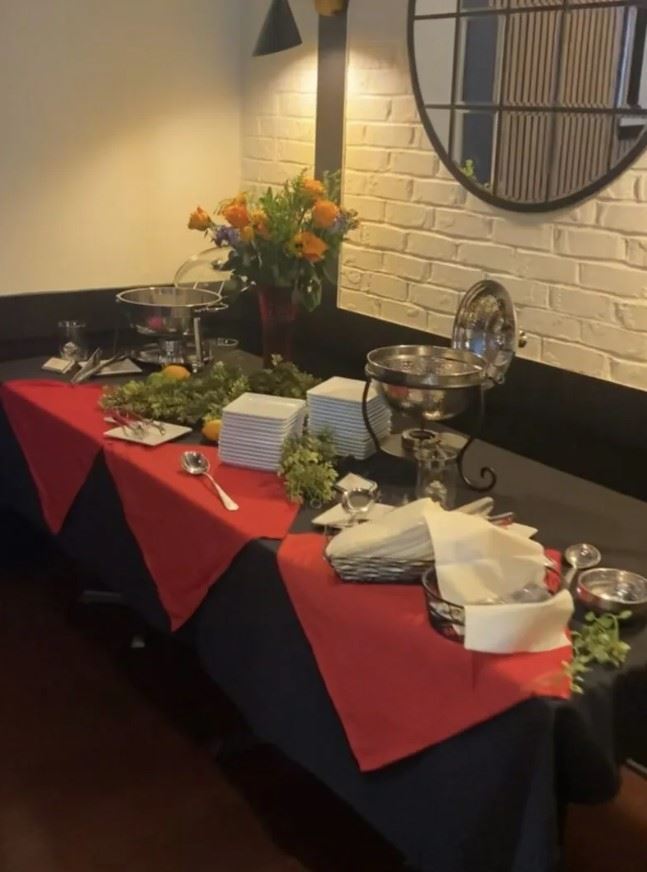 Tables and chairs are provided. Tables are 5, 6 and 8 ft rectangles