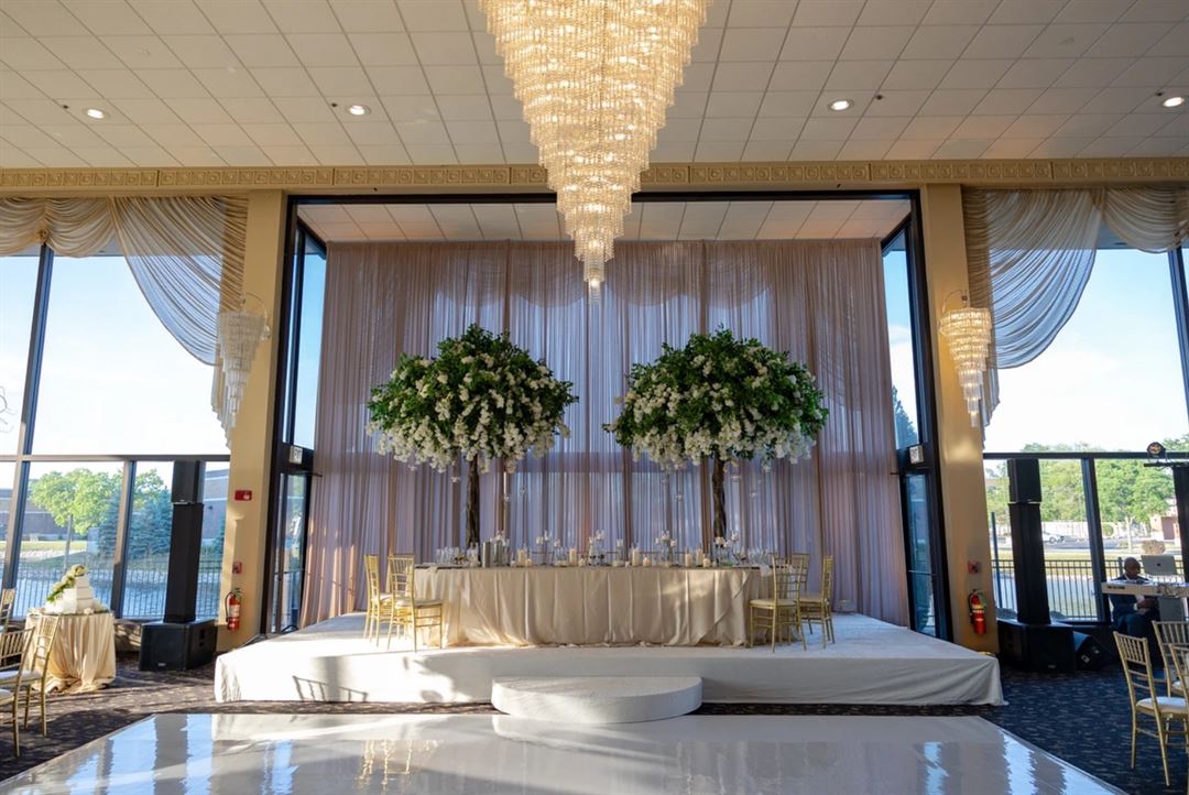 The radiant Grand Ballroom makes a spectacular impression with its panoramic two-story windows, glittering crystal chandeliers, and spacious dance floor. Natural light fills the room during daytime events, transitioning to stunning sunsets and sparkling reflections off the lake as day moves into night.