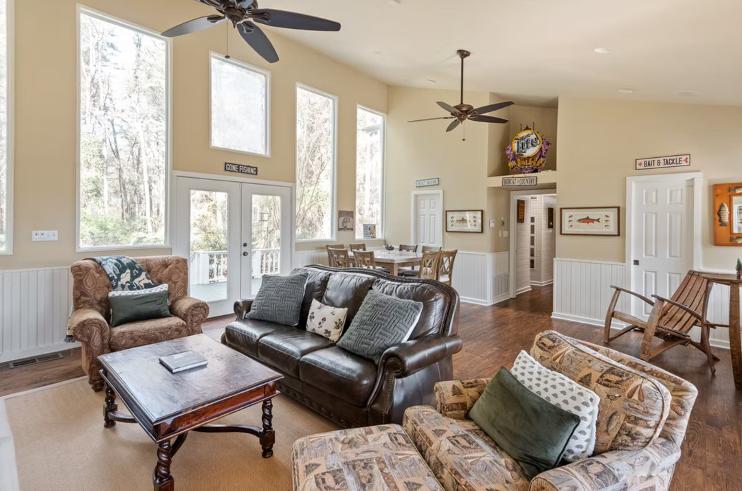 The Veranda provides a range of high-end amenities to elevate your stay. Guests can enjoy fully-equipped gourmet chef’s kitchens, a beautifully renovated 1914 Victorian home, and amenities perfect for large gatherings. The estate also features a private on-site and illuminated basketball court, a resort-style pool, and a stunning five-acre lake just steps from the back porch. For those seeking outdoor adventure, scenic hiking trails wind through the lush surroundings, offering a peaceful escape into nature, or enjoy a day of fishing on our fully stocked lake. With high-speed Wi-Fi, over 10 smart TVs, and easy access to local attractions, The Veranda ensures a seamless balance of relaxation for you. Experience the tranquility of this hidden gem, where the beauty of nature meets five-star accommodations.