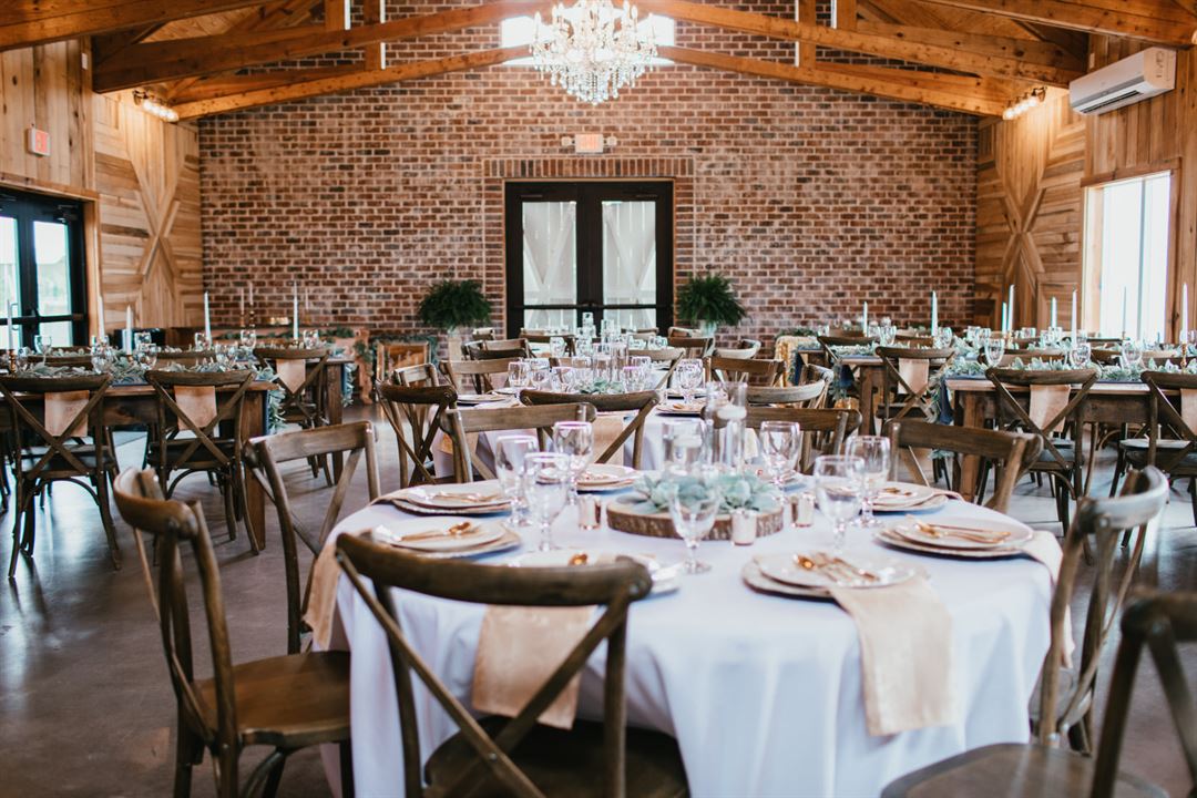 The main reception area is adorned with beautiful chandeliers, wood walls and exposed brick, and there is an open air patio with string lights overhead, and a covered pavilion with chandeliers that can be used for a ceremony spot in the event of inclement weather. We also offer a decor package that includes complete setup and clean up. Contact us to start planning your special event!