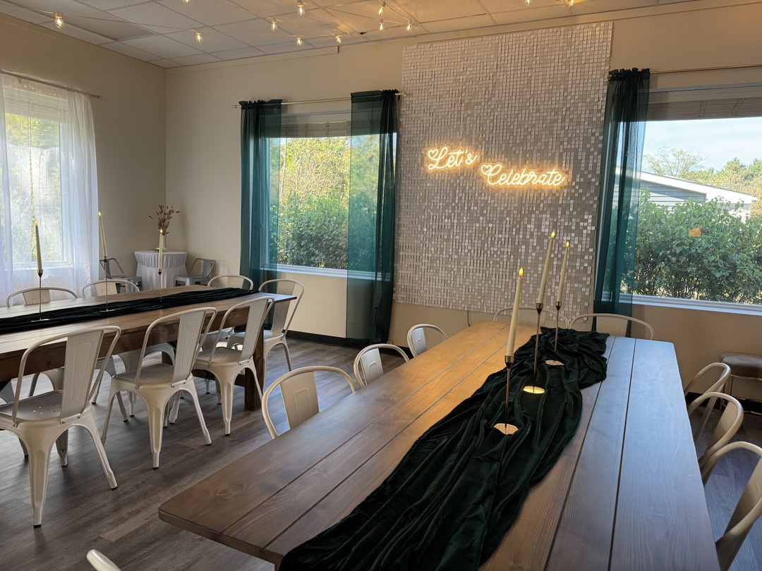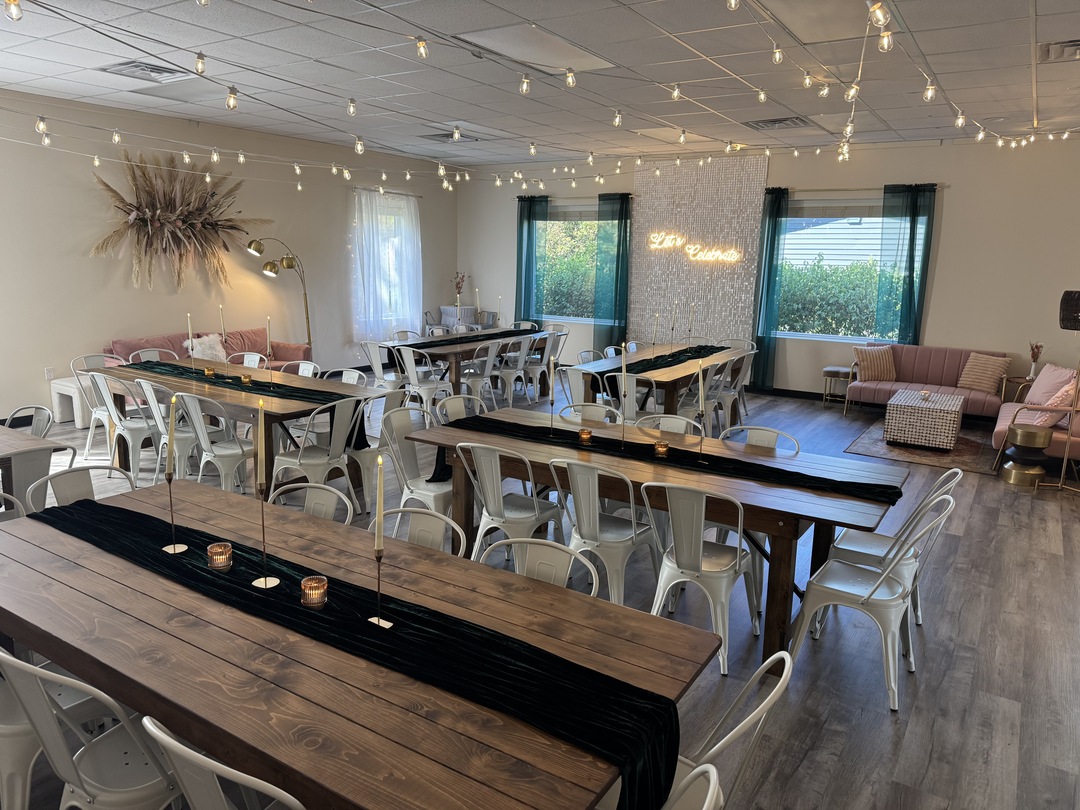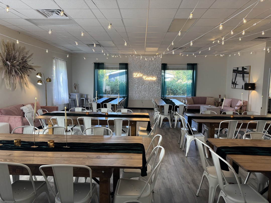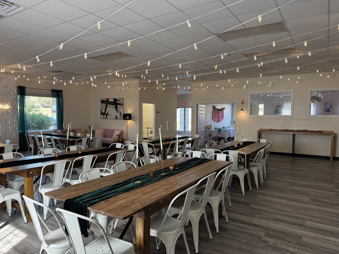 With two unique spaces — the Gathering Room (seating up to 60 guests) and the Petal Parlor (seating up to 40 guests) — our venue can accommodate both intimate gatherings and larger events. Guests will appreciate plenty of tables and chairs, flexible floorplans, and the option to bring in outside catering or work with our trusted local partners.