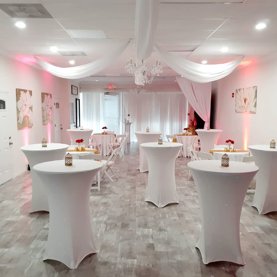 The space is completely renovated in early 2020. We are talking about a beautiful open space with up-lighting, chandeliers, drapes and a full AV (audio visual) system. Our kitchenette comes with a double sink, fridge, dishwasher and microwave.