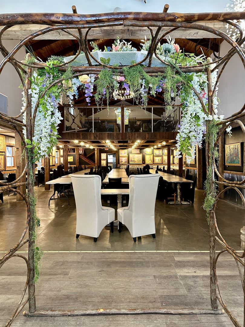 The Gallery is furnished with tables, chairs, bar area, stage, dance floor, and a fireplace. Upstairs has additional seating and a separate large room that can be used for corporate meetings or grooms room. In addition, there is a Newlywed Suite with bridal party makeup vanities.