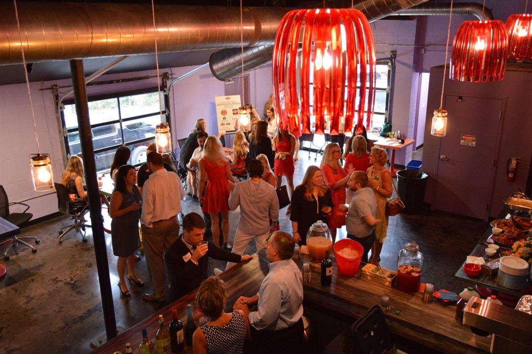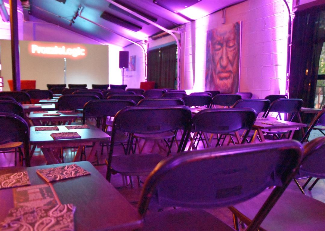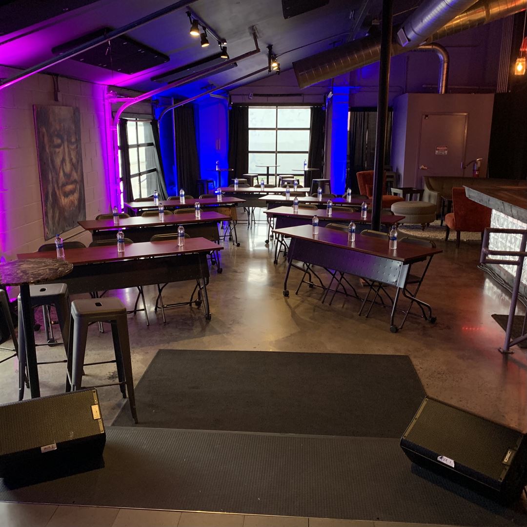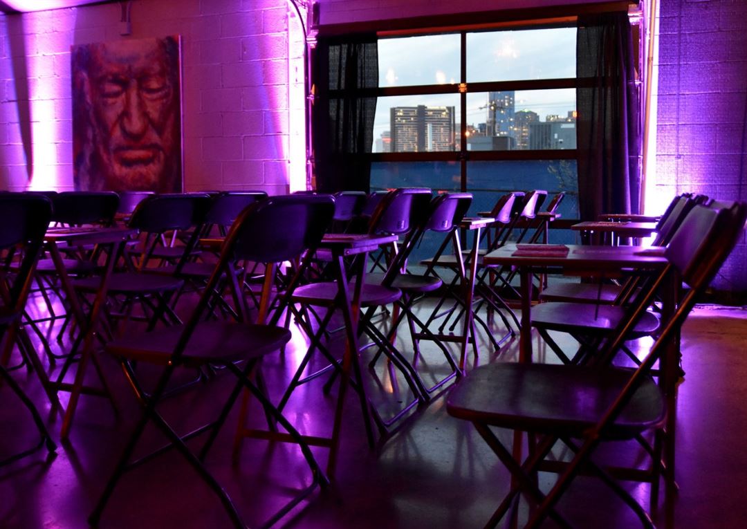 InDo Nashville is a fun, artistic event space in the heart of SoBro. Lots of natural light with skyline views of downtown. The 1,400 square foot versatile space includes a stage, PA, built-in bar, and the ability to extend outside with tents, via our glass garage doors. The space can be set with tables for seated meals, cocktail tables, rows of seating, or board-style meetings. It is perfect for parties, presentations, product launches, showcases, music, comedy, and spoken word performances, live podcast tapings, rehearsal dinners, intimate weddings, and content capture space. We are an LGBTQ+ welcoming location.