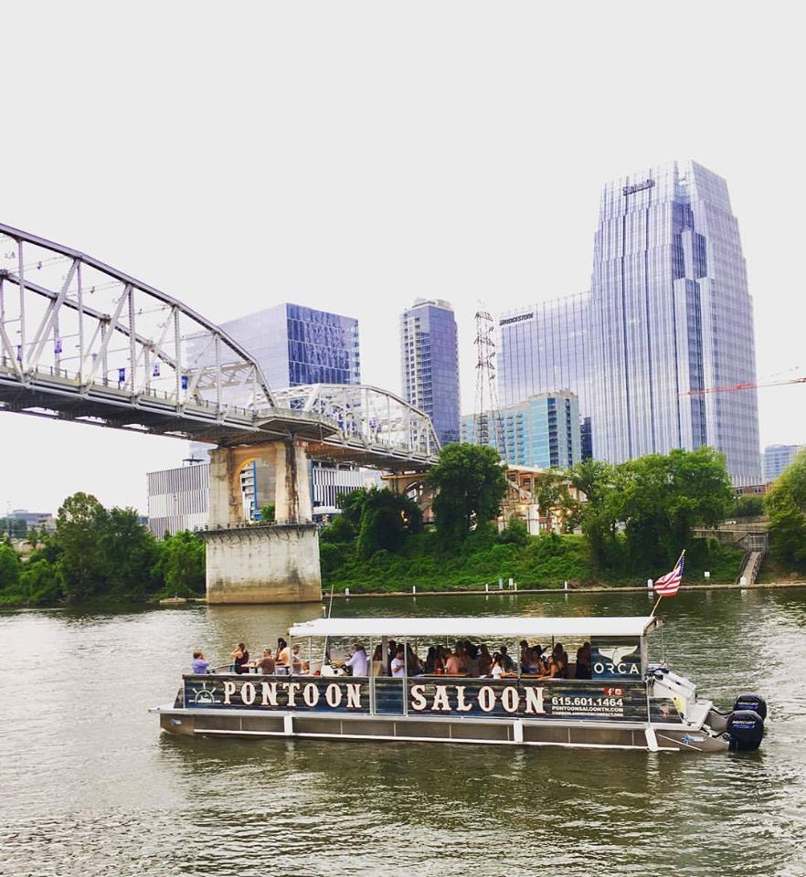 The Pontoon Saloon is Nashville’s premier party barge on the Cumberland River. As a matter of fact, we are one-of-a-kind in downtown Nashville, as the only River Cruise on the Cumberland River! Step aboard the 50 foot floating Saloon equipped with an open floor plan and plenty of room to hit the dance floor! Equipped with sound system, server, and catering and beverage options to suit every group. The Saloon holds up to 45 guests with table top seating and an open top bow. This cruise gives you 2 hours to enjoy the river and amazing views of downtown Nashville.