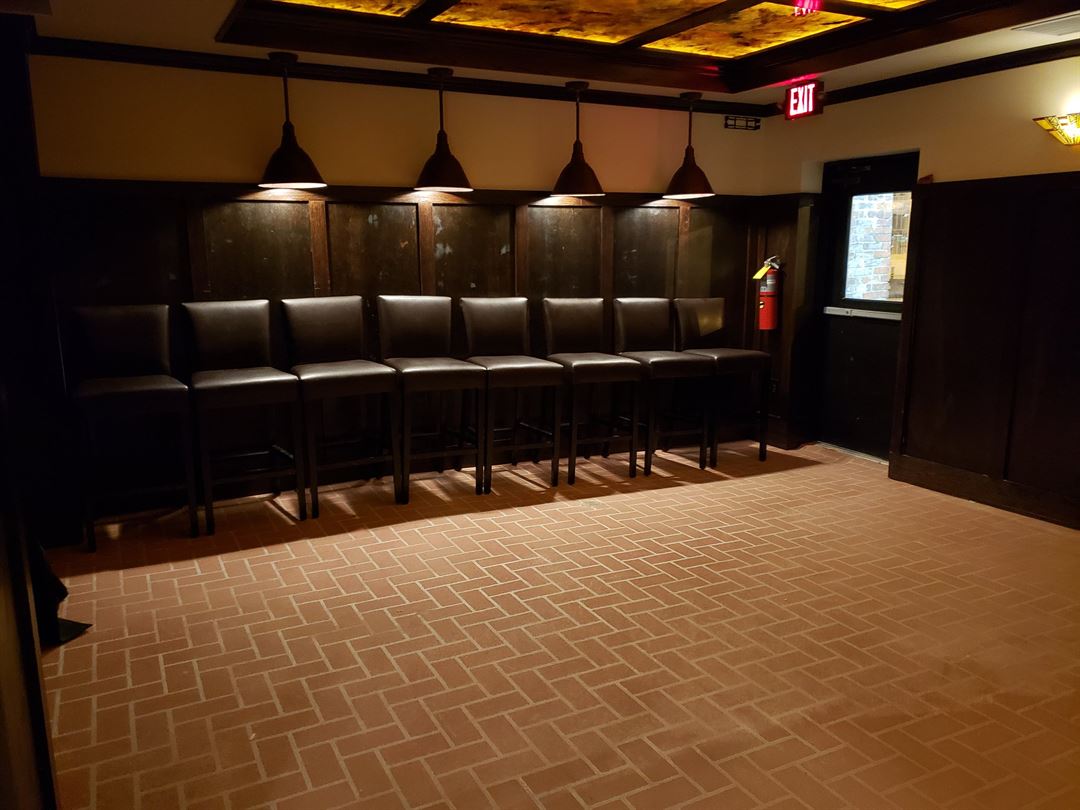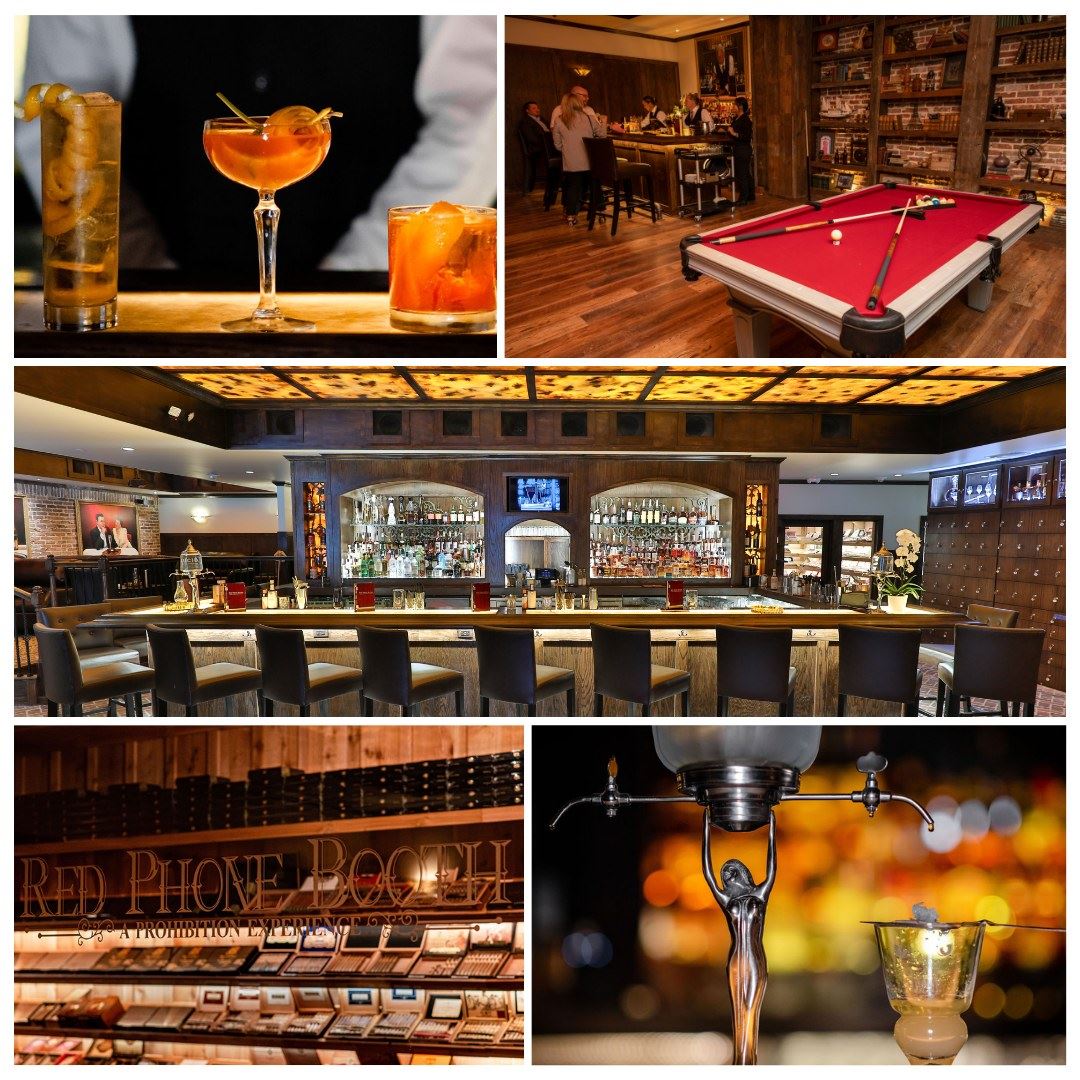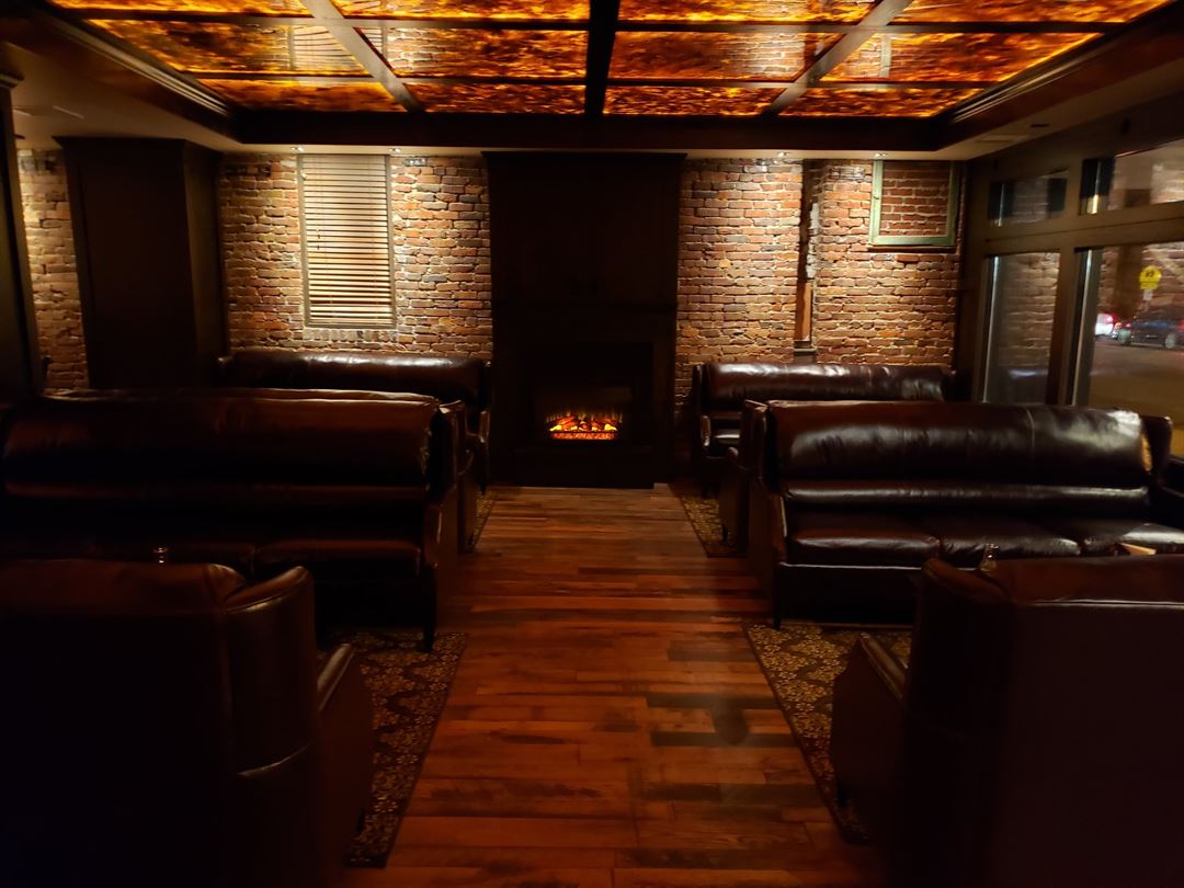 Showcasing the 1920s speakeasy theme, the venue features restored original brick and reclaimed tobacco barn wood floors, a honey onyx bar, intimate fireplaces, custom Italian leather couches, and hand-painted ceiling with back lighting. There is a 100% fresh outdoor air system accompanied by five 2,500 cfm air purifiers to ensure little to no smoke in the air. A private room in the back is also available to rent for private events.