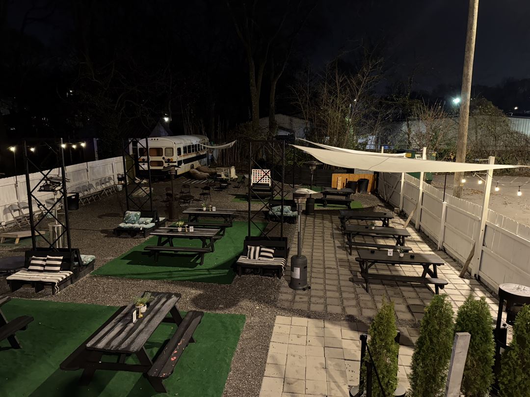 Outdoors, we have a spacious 3,000-square-foot area with seating for up to 70 guests, picnic tables, a patio, an outdoor stage, and an additional restroom. This outdoor space is perfect for larger gatherings, live entertainment, or relaxed, open-air events.