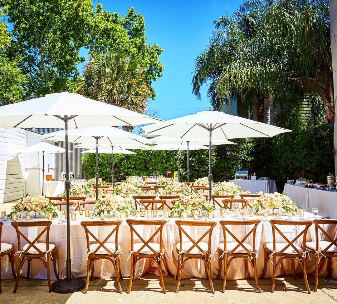 Wedding parties have the option of hosting their ceremony and/or reception in our luxurious poolside courtyard or den area. Our den area inside of the mansion can comfortably accommodate up to 50 chairs for a ceremony. The poolside courtyard can accommodate up to 65 chairs for a ceremony. A maximum of 75 guests can be accommodated for both ceremony and reception, depending on the set-up style.