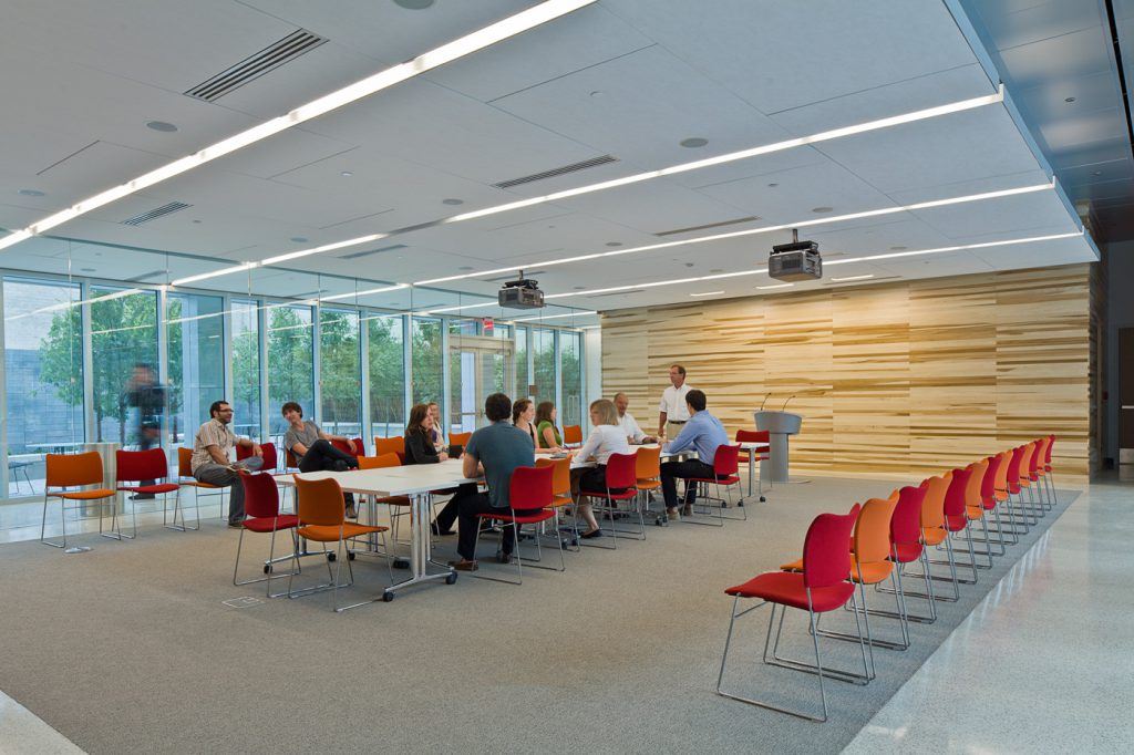The Center has a 100+-person conferencing center including state-of-the-art audio/visual equipment. We also have a large, sunlit inner atrium and landscaped interior courtyard. The conference room can be arranged to accommodate small and large groups alike, and a partial kitchen is available to facilitate catering for event rentals.