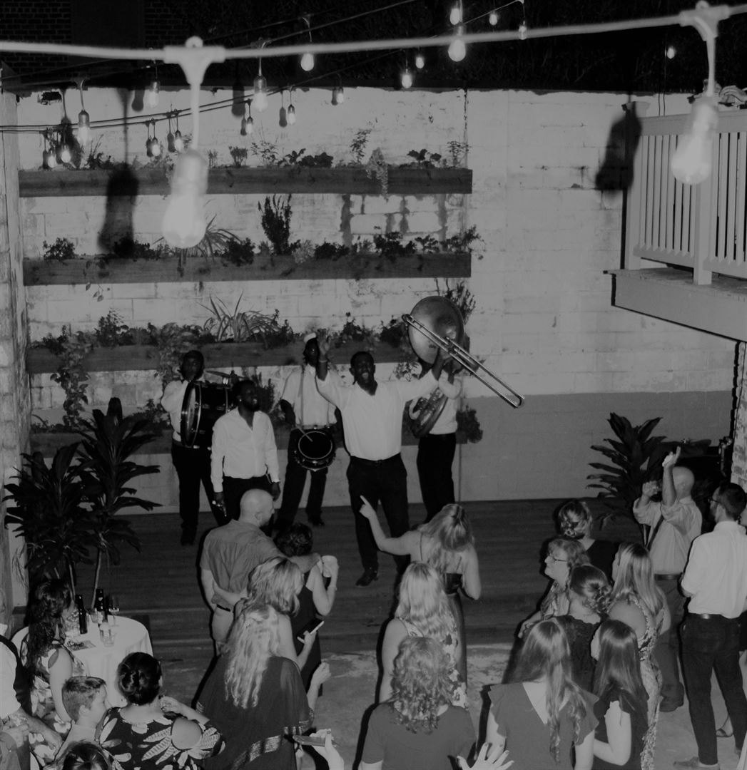 The event space includes two bathrooms, an expansive custom island, a beautiful bay of vintage double French doors, the front courtyard along Magazine Street and Erato, and the back courtyard that features a wraparound balcony, a flower wall and stage. Additionally, two gorgeous suites are available for overnight bookings.