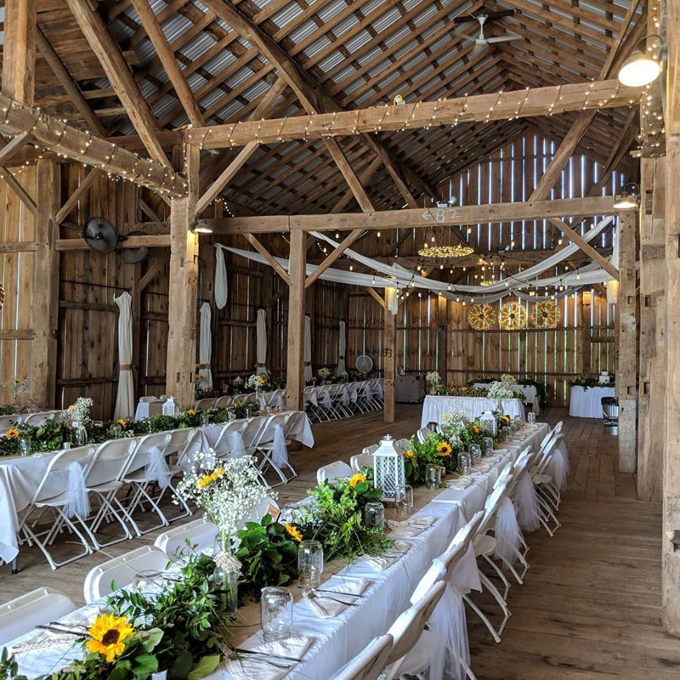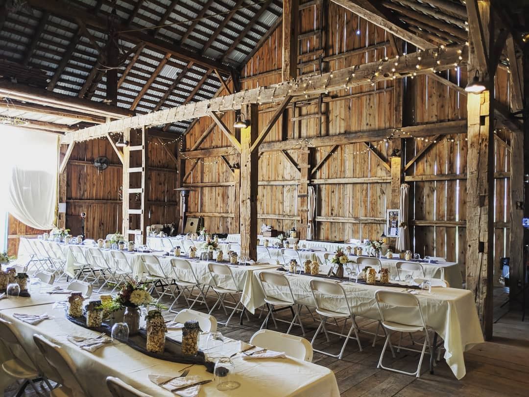 The timber frame barn was built in 1905. It is 3,300 square feet and can comfortably seats 200 guests, with plenty of room for dinner and dancing. In 2012-2013, it was renovated to restore its original structure. Wagon wheel chandeliers and a unique bar constructed from French wine barrels and the original barn doors were added. The surrounding farmland offers stunning views and sunsets.