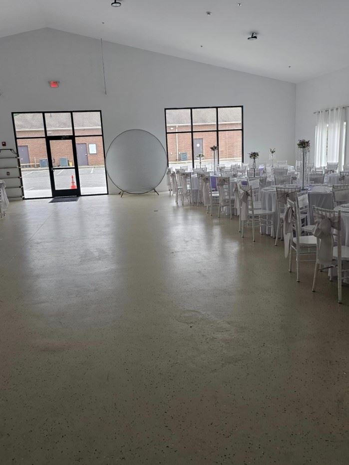 Our venue is equipped with over 250 chairs, 30 round tables, and 4 six-foot tables to accommodate your event needs. The expansive interior features 30-foot cathedral ceilings and ten-foot windows, filling the space with natural light.
