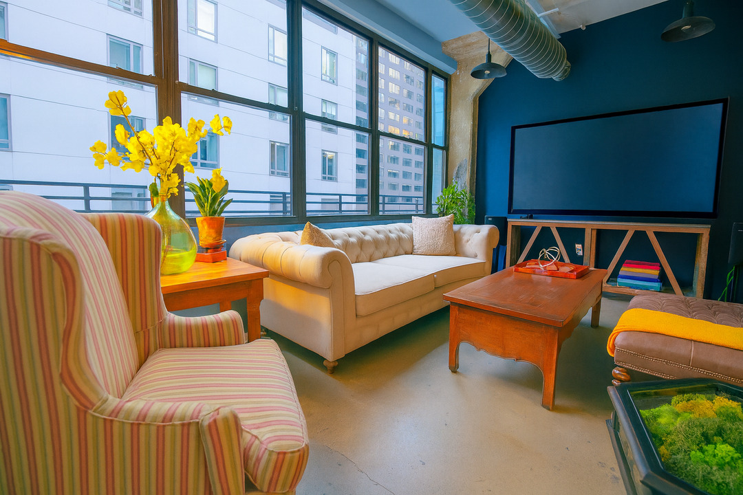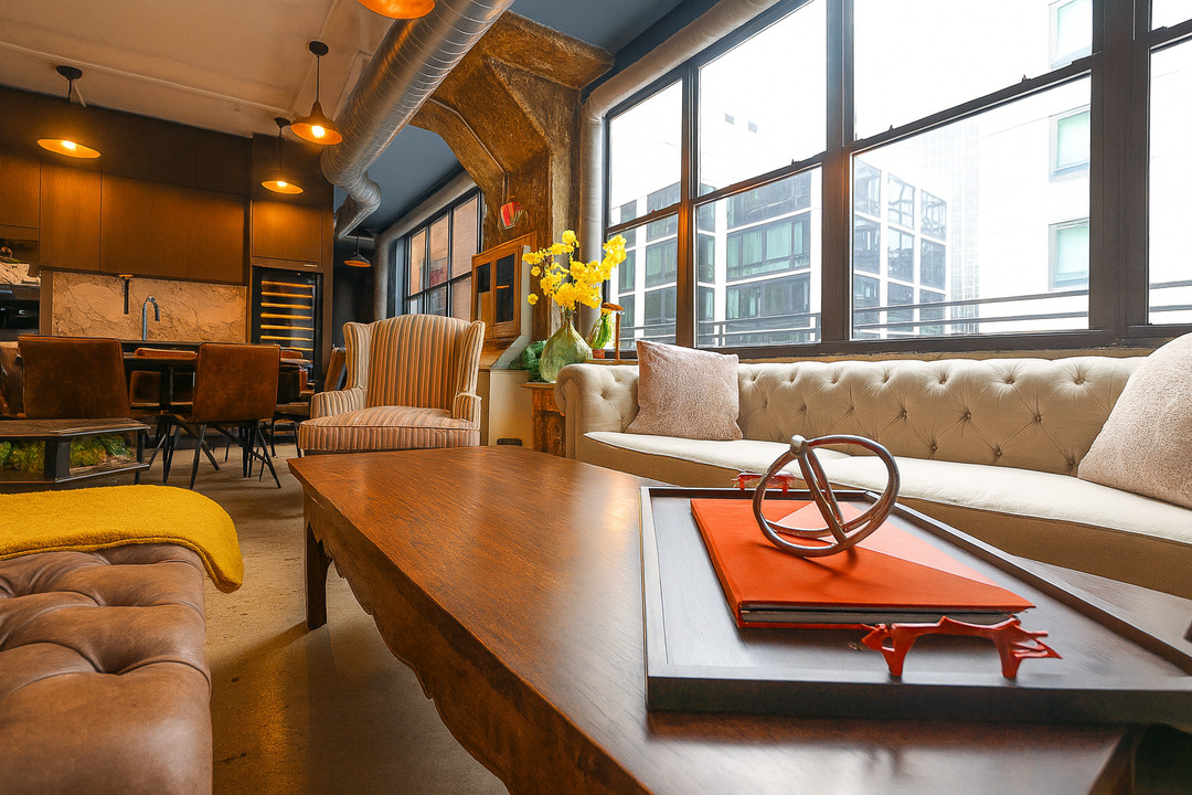 Inside, guests are welcomed into thoughtfully curated lounge areas featuring sofas, armchairs, ottomans, coffee tables, a large TV, and a stereo system with iPhone/iPad hookup — all accented by soft lighting and a refined, speakeasy-style mood. The environment feels cultured and intimate, making it just as fitting for an executive strategy dinner as it is for a chef-led supper club or a meaningful celebration with friends.