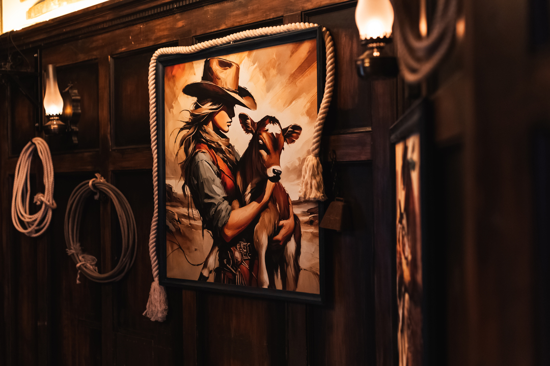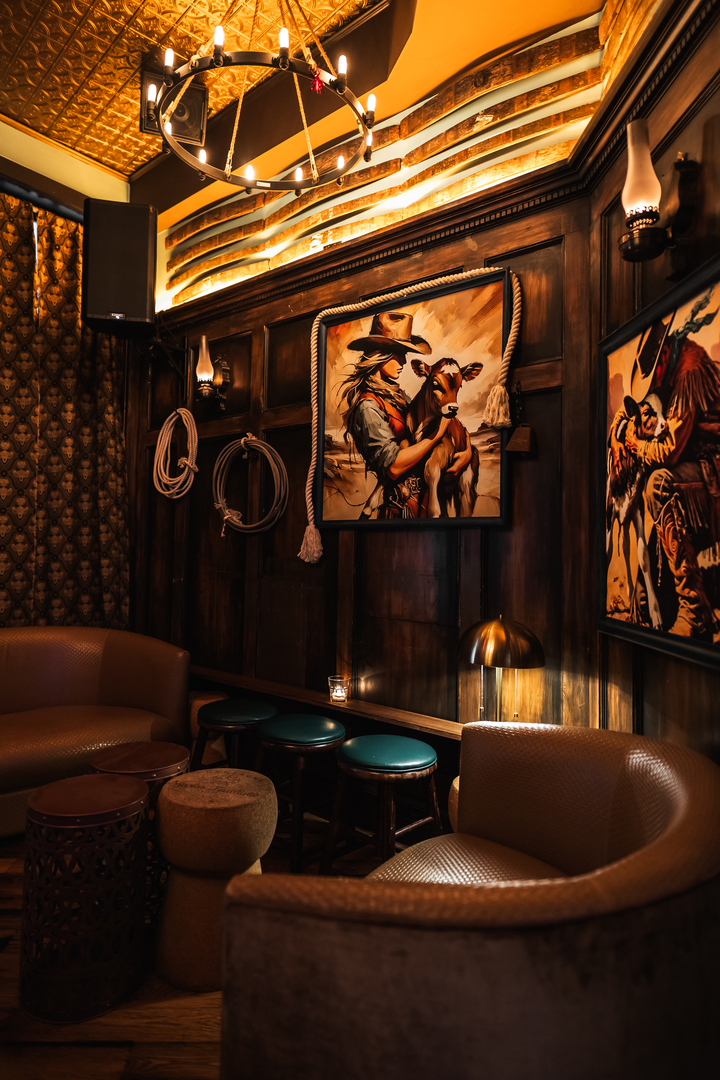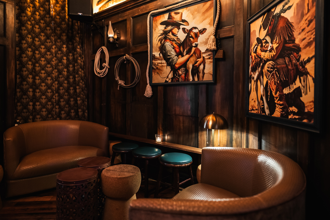 • Ambiance: Western saloon with Wild West decor, including a life-sized horse statue and antique props.