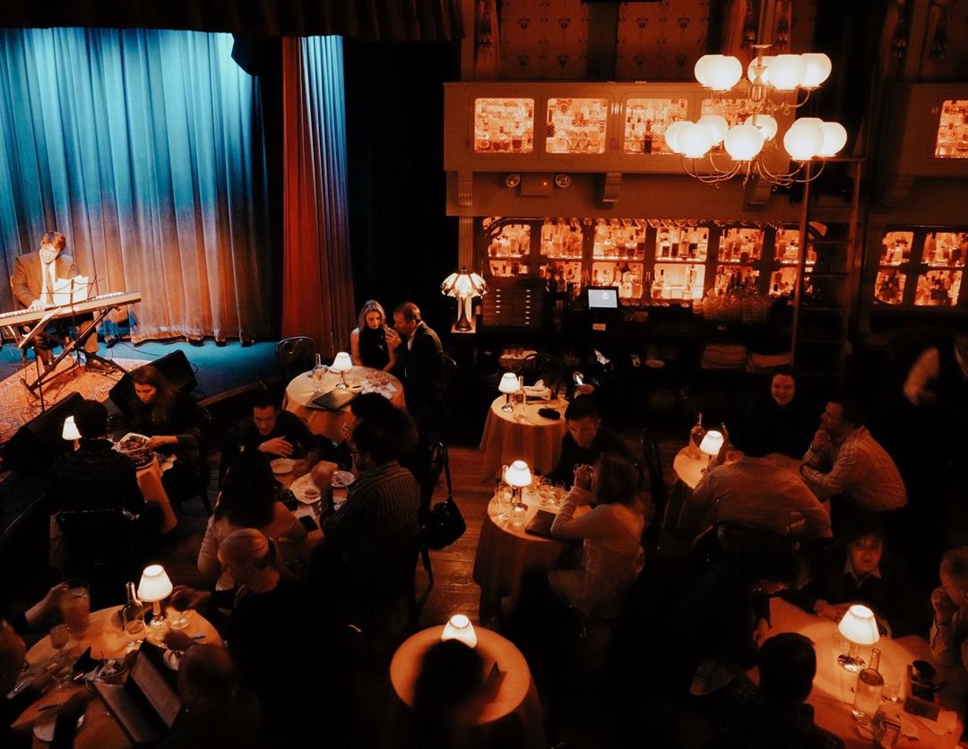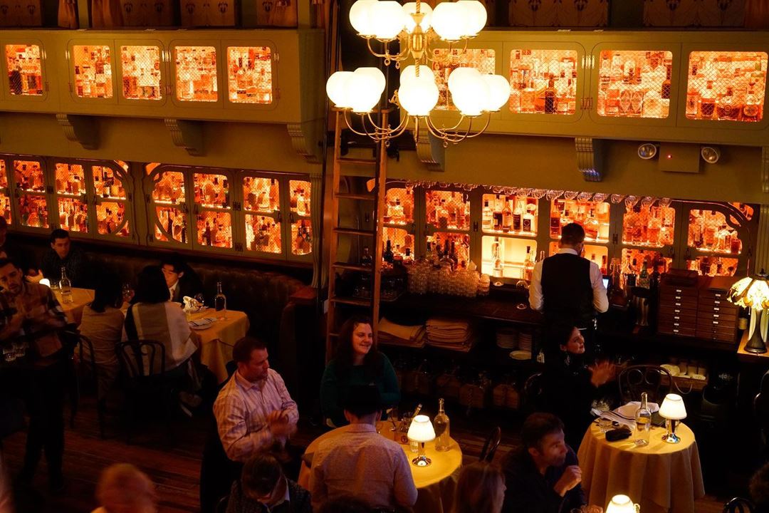 Rich leather banquettes, hand-painted coffered ceilings and 100 year old reclaimed floorboards mingle with vintage Italian wallpaper, black walnut tables and fine wood moldings to create a sumptuous, refined setting.