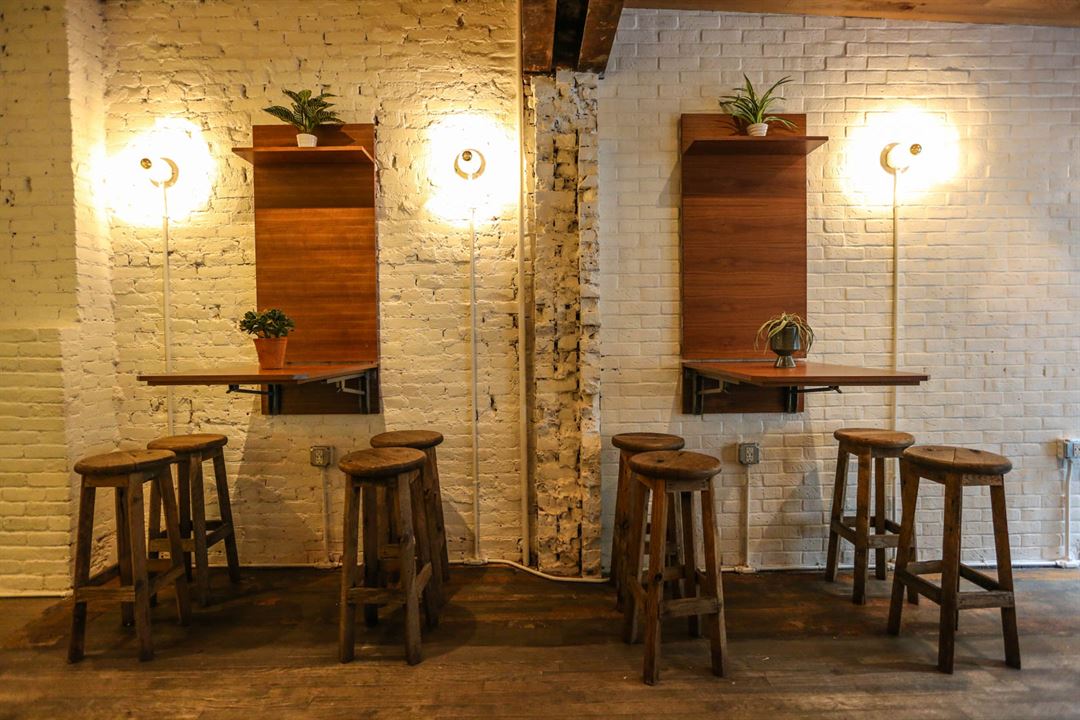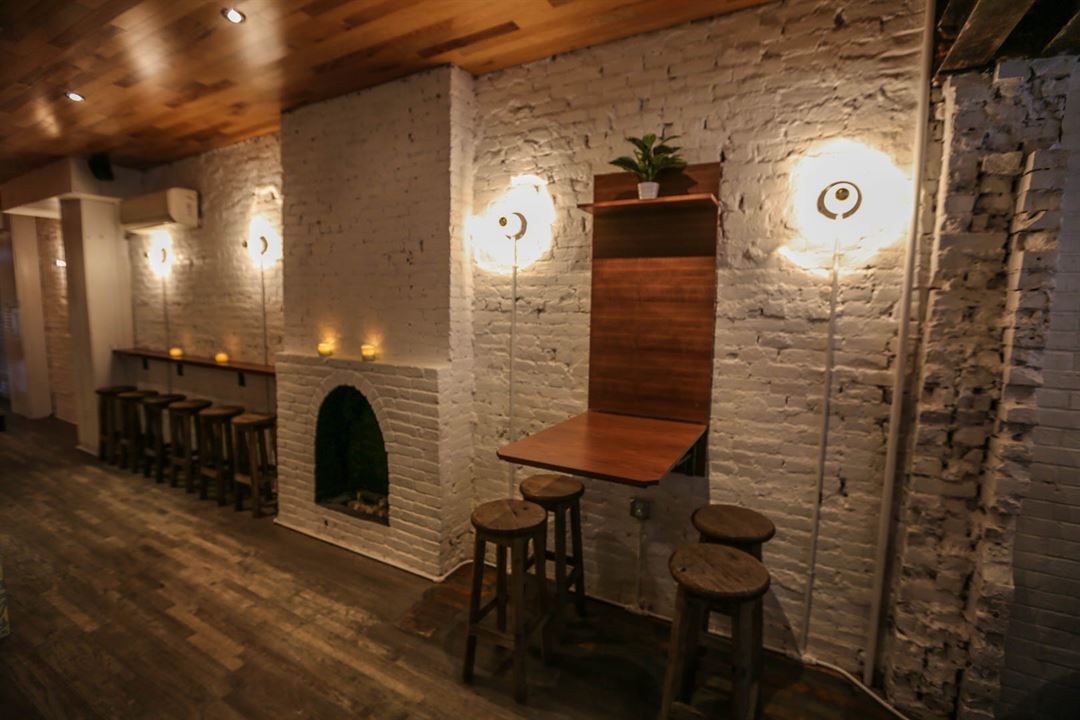 The picturesque garden, illuminated by beautiful lit up trees, underscores old New York charm. Recently renovated with barn-wood paneling and painted white brick throughout, the space is accented with an ornate brass ceiling and an upstairs lounge with lounge seating, a cozy fireplace, and a separate bar area.