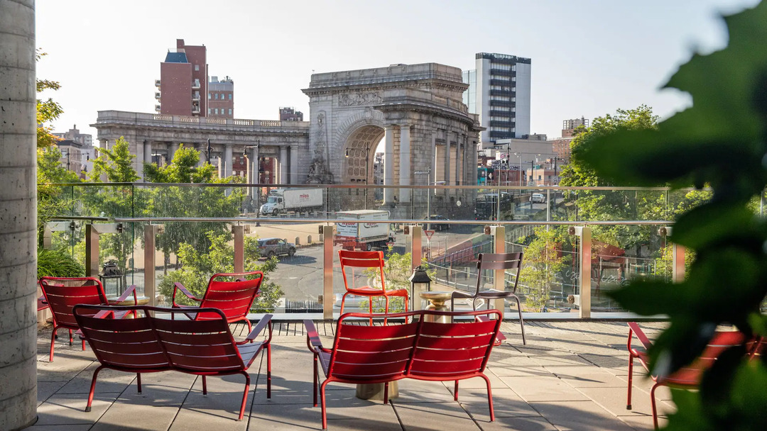 5,000 square foot expansive garden with lush greenery and incomparable views of the Manhattan Bridge and Bowery.
