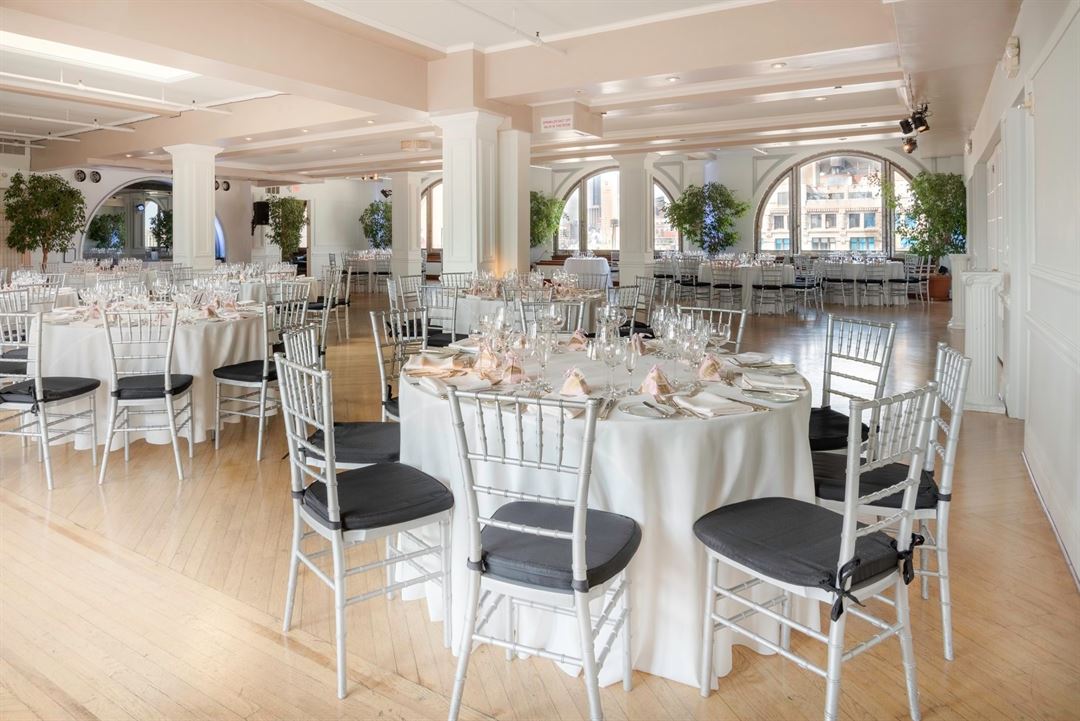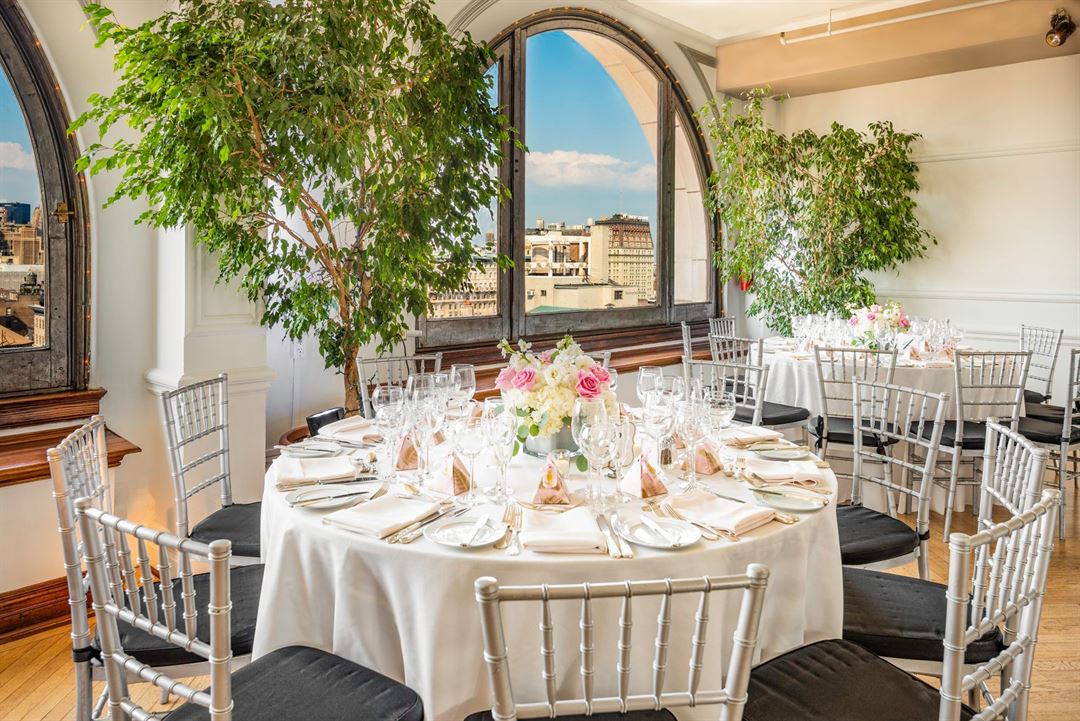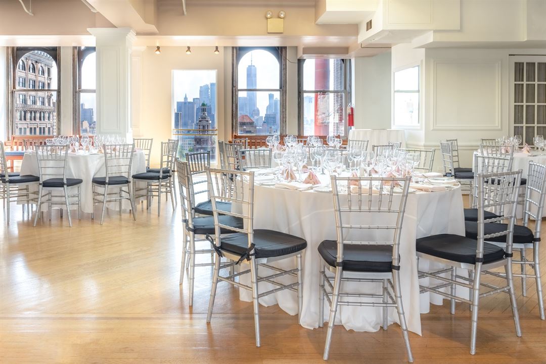 My husband and I created our "fairy tale wedding" by renting the Manhattan Penthouse and bringing in outside catering. Located on the top floor of the historic building near Union Square, this bright 8,000-square-foot space can accommodate more that 200 seated guests (with dancing). There are arched twelve-foot-wide windows that yield panoramic views that stretch from Wall Street to Times Square, and Brooklyn to Jersey City. The penthouse really was a big surprise for entering guests who were struck by the many dramatic and panoramic views offered by the huge windows. And, to complete the effect: a strikingly beautiful stained-glass bar. The loft space is open and airy with more window than wall. There are paneled window seats, a beautiful grand piano, and illuminated ficus trees that surround the polished floors. The space rental cost us $3500, but of course the price differs depending on the day of the rental. Our wedding was a Sunday night - and yes, this is cheaper! We were married over Memorial Day Weekend, and with many out of town guests the Sunday was perfect.Rather than a full bar, we served wine, beer, and a special martini bar - "something old (classic martini), new (apple martini), borrowed (my raspberry cosmo recipe), and blue (Tarheel martini)." This way, we saved a ton by not having to stock all of the various mixers, etc. a full bar requires. Overall, the venue was more than perfect - chic, historical, world class, and we had no issues or problems at all. It really did make for a beautiful wedding! I would recommend Manhattan Penthouse heartily to anyone.