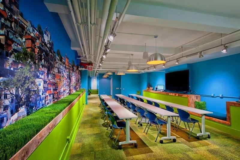 OFFSITE’s inspirational lower level, set along an urban Rio de Janeiro backdrop, offers adaptable classroom-style seating for 25 people and an 80” LED TV. This sophisticated think tank is a cooler, more casual place to hash out important ideas, hold a training session, participate in team building exercises, or simply celebrate.