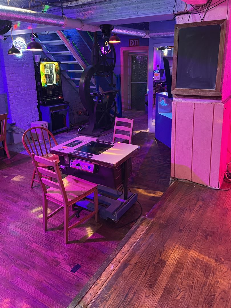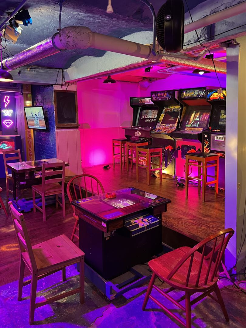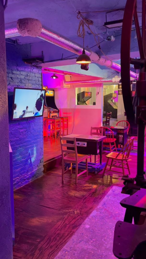 An 1980's inspired flashback arcade invoke your inner Tron or Breakfast Club at your special event. This is just a block and a half south from famed Washington Square Park and two blocks from Mc Dougal St. This Greenwich Village location is close to many world renowned restaurants, music venues and comedy clubs. The space holds up to 60 people, all of the games are set to free play. There is a jukebox, fog machine, a bubble machine, a stage with stage lighting, microphone and PA, camera system, projector, chairs and tables, a cute little bar. All the lights are programable and you can hook into the house system with a wire or Bluetooth. The ventilation is good and the space is sound resistant. This is the basement of coffee, vintage and smoking accessory shop.