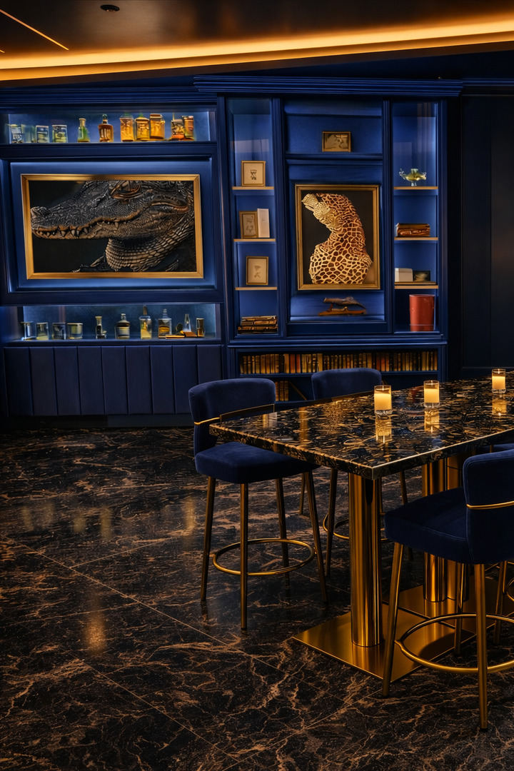 • Sophisticated, moody luxury interior with deep blue, gold, and marble finishes