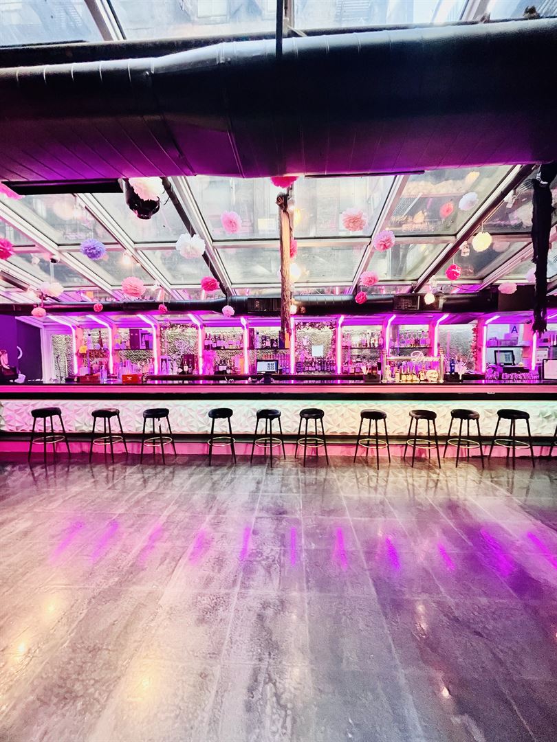 The space is characterized by exposed brick walls and metal accents, which lend an industrial edge to the space. But it is the Pink neon lights that truly set the atmosphere of the bar. Our neon lights fill the space, casting a Pink vibe on everything and adding to the overall neon paradise theme.