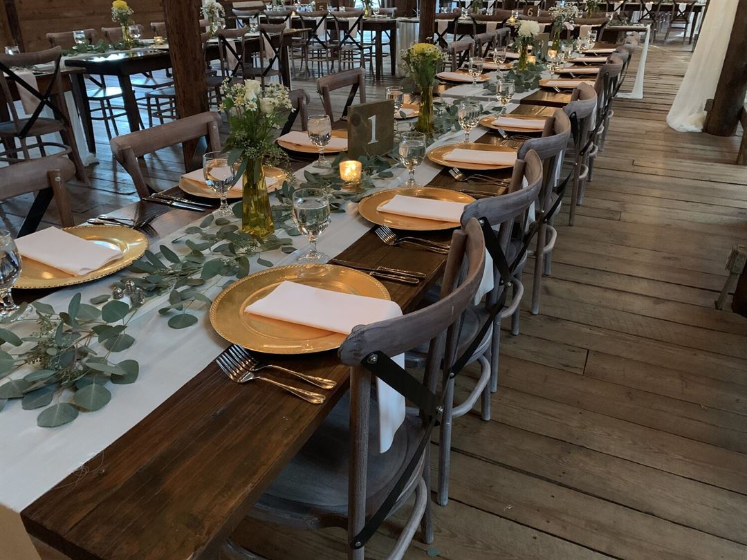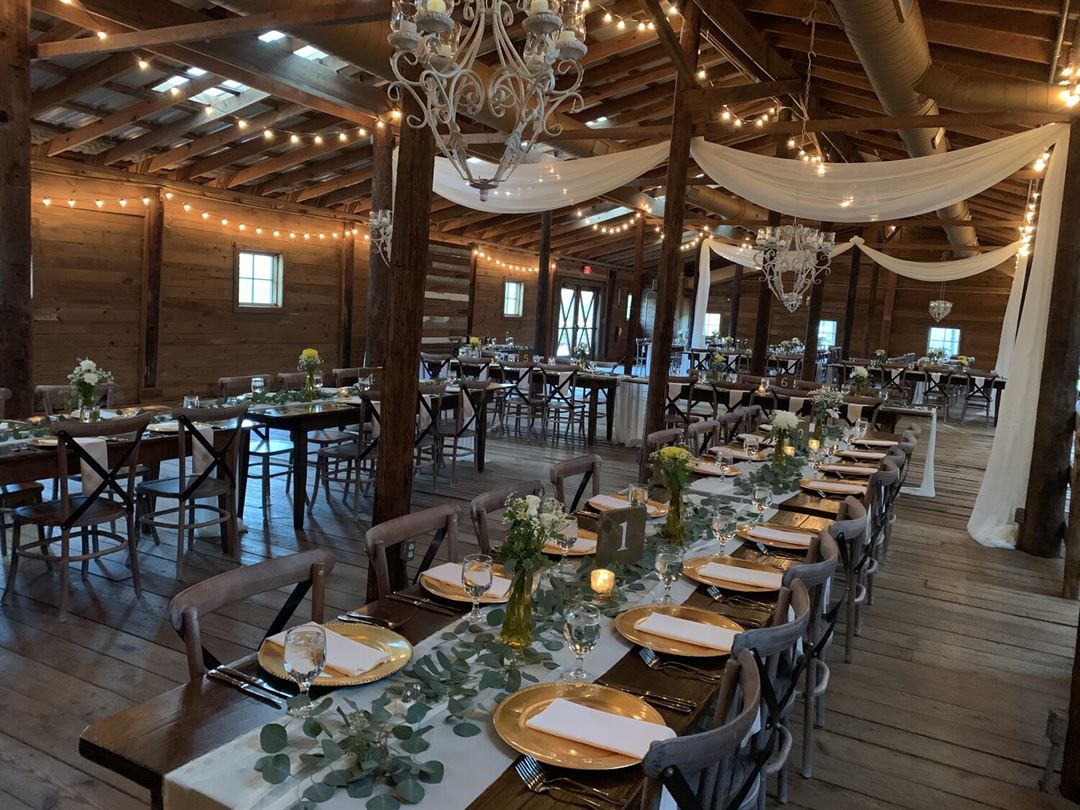 Vinewood also offers some wonderful items that we believe add to this historic barn’s authentic character that are included in The Stables’ rental fee. Included in the rental fee for The Stables of Vinewood are harvest tables custom made from antique heart pine and mix-matched vintage wooden chairs to seat up to 150 guests. If you are anticipating over 150 guests, we provide additional tables and bench seating for up to 250 guests maximum at an additional fee. We also include a 20 X 20 dance floor, vintage pub tables, oak bourbon barrels, strung cafe lights, burlap table runners, hundreds of mason jars, old ironstone crockery, milk glass vases and tinware pitchers for flowers, metal lanterns, crates, vintage books and a variety of chalkboards.