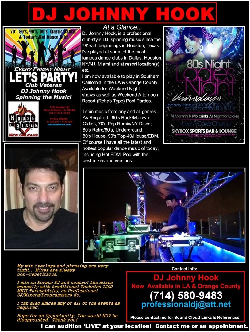 My name is Johnny Hook, I'm a professional club-style DJ, spinning music since the Early the late 70'S. I've played at some of the most famous dance clubs in Dallas, Houston, NY/NJ, Miami-South Beach, etc.