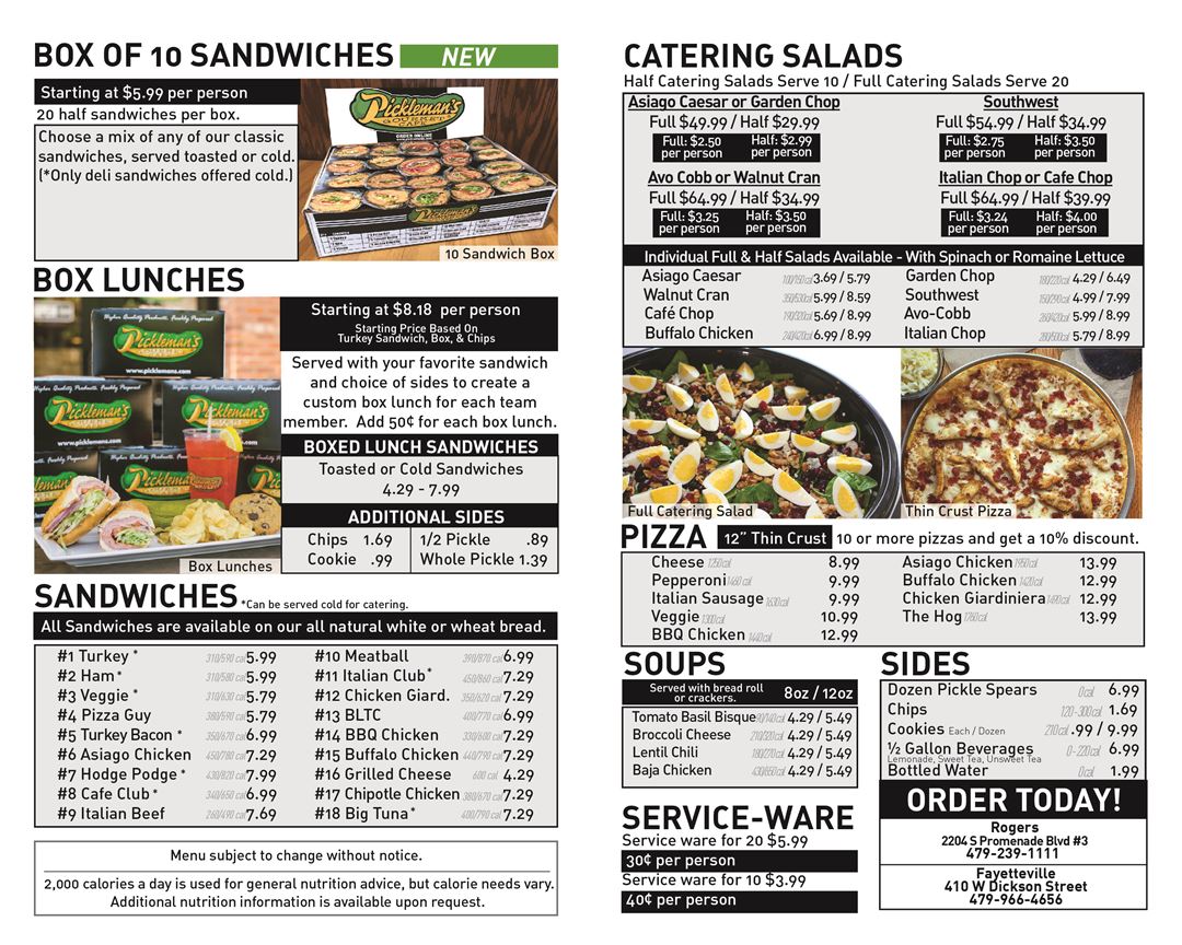 Whether you need food for the next big game, want an enjoyable solution for your company's next party or even need catering for your wedding rehearsal dinner or wedding day, we have delectable foods for you to choose from. From toasted sandwiches to gourmet salads and pizzas, we use top-end ingredients to leave your guests with a memorable experience. Pickleman's also offers several options for soup, as well as made-from-scratch cookies. And don't forget the PICKLES!