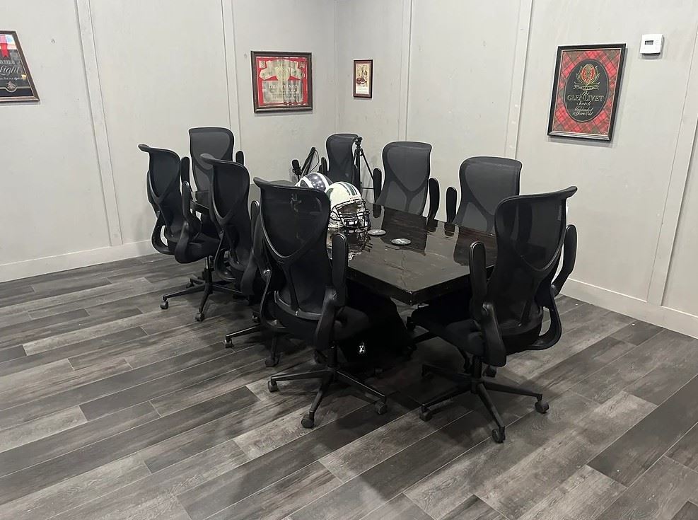 When you walk in through the business corridor and finally enter the back [speak-easy style] room, you are welcomed with an exquisite site. A custom, hand-built conference table that seats 8, a luxurious seating area with a sectional couch coupled with 2 arm chairs and a fire place, 6 big screen T.V.'s, a bar that seats 10, a pool table, and a ping pong table.