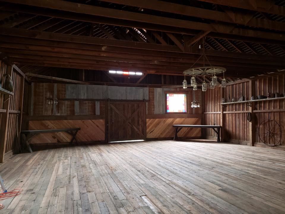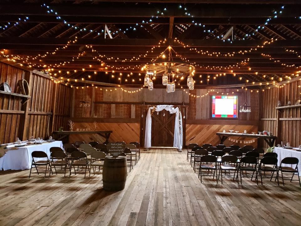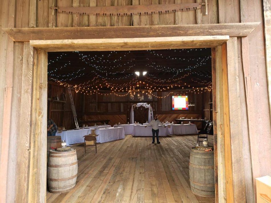 The Stockyard Social hall is the perfect place for a Weddings, events, banquets, dances and more. Experience the magic. A simple old Barn turned into a magical place to make memories. It has 2400 Sq Ft enclosed with exposed ceilings, interior board and baton over a mortise and tenon timber Fram with large sliding door access on all four sides. 1 lean-to at 600 Sq ft on the side of the barn is perfect for BBQing. 1200 sq ft of ADA accessible deck with wrought iron accents and wide live edge rails to facilitate casual conversation over drinks and delicacies. 4400 Sq Ft of outside area to expand your wedding into the great outdoors. Beautiful rustic interior original to the 1870 build with period stained glass windows. Rustic farming antiques decorating the walls adds period character. Beautiful wagon wheel chandeliers with soft natural lighting throughout. With room for all your needs The Stockyard Social Hall is open on the date you requested. Whatever your needs are, we can help make your event the best possible.