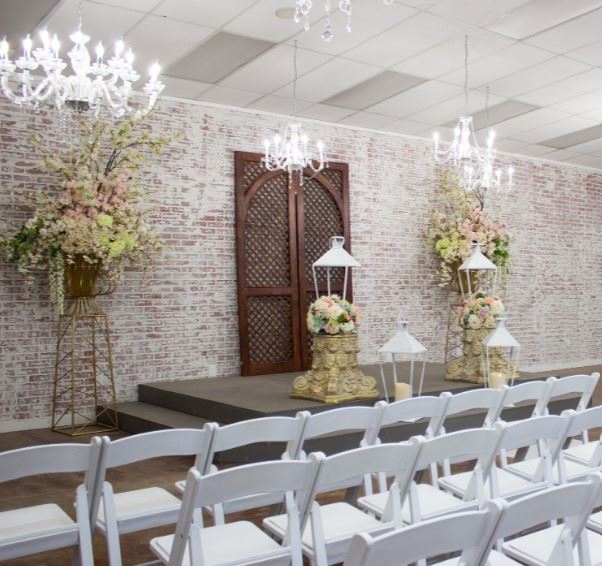 A spectacular space with dazzling chandeliers overhead, exposed brick walls, and a staging area. The stage is adorned with two large wooden doors and creates a beautiful background for wedding ceremonies. Altogether, the room is ideal for ceremonies and receptions as the open-plan layout allows for custom seating plans.