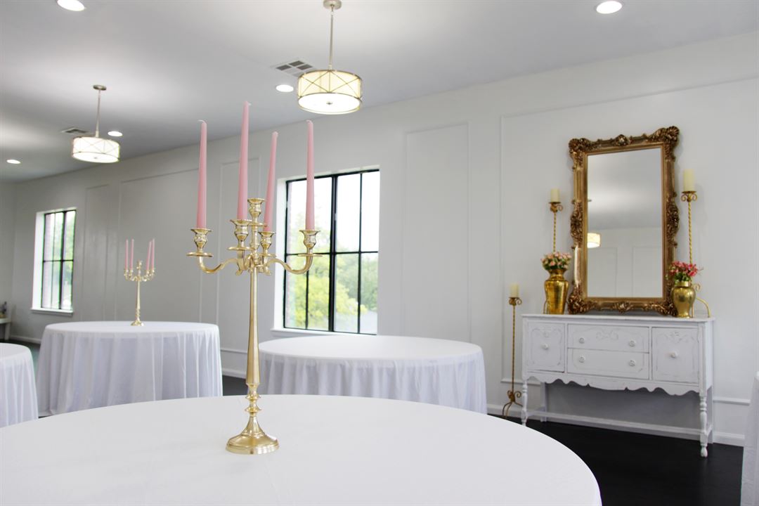 Our white walls create a beautiful blank canvas for whatever vision you might dream up, while tall ceilings and modern chandeliers create a timeless atmosphere that will leave a lasting impression on your guests.