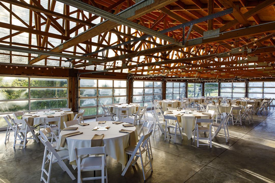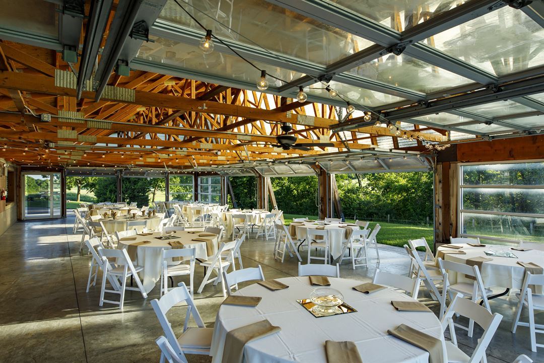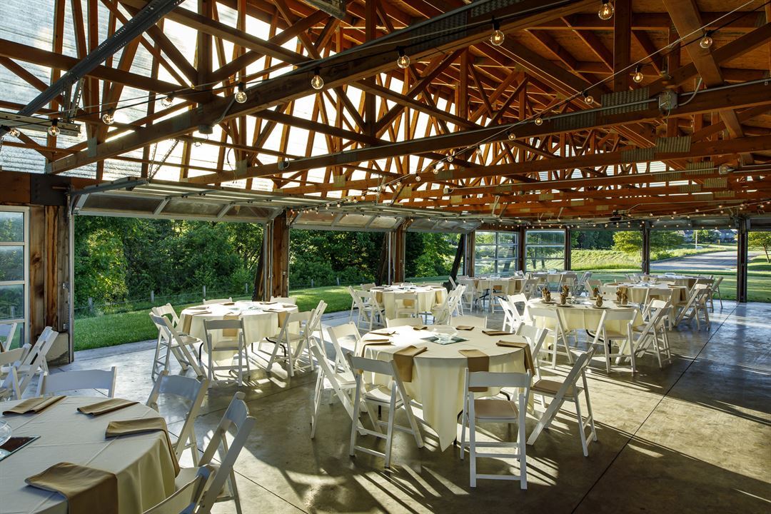 Our separate event pavilion offers the seclusion your event needs with barriers of trees along the Northeast side. With 8 separate rolling doors, you also have the option to open up virtually every wall of our pavilion, letting nature in. We offer exposed wooden beams, strung with festoon lights to perfectly light your event. With a private bar and restrooms, you can be completely removed from the world while enjoying your private event.