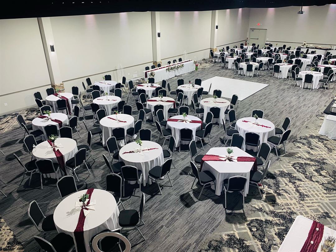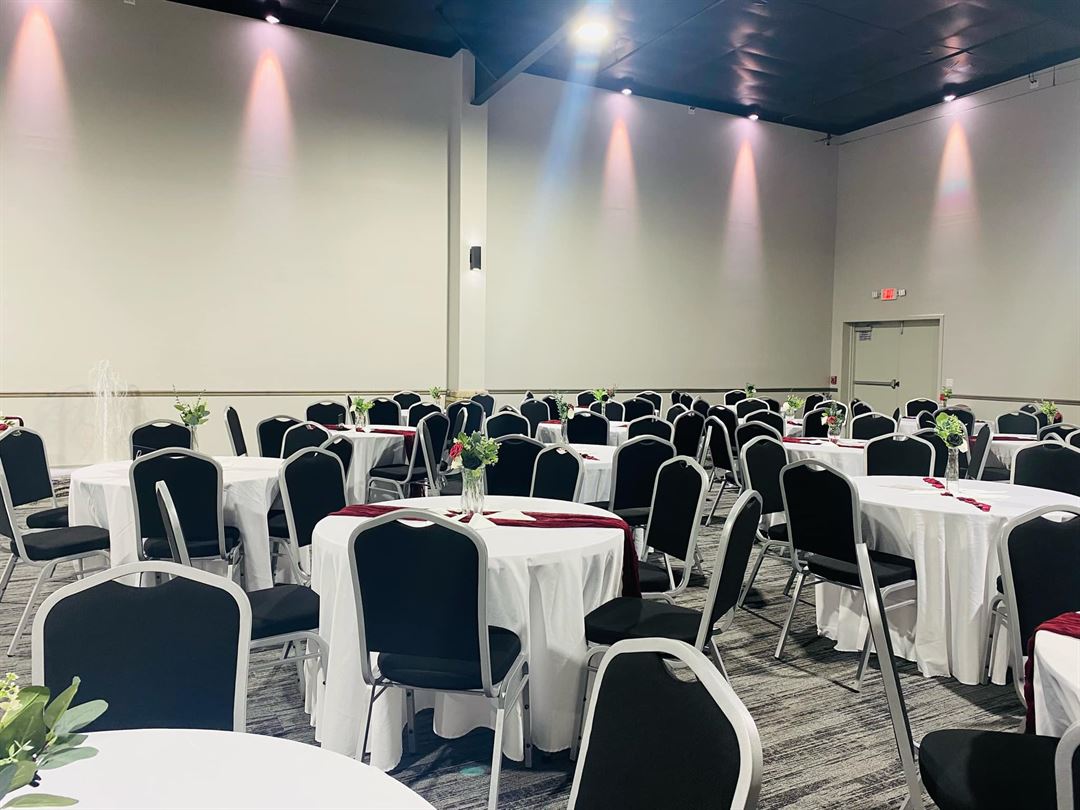 We provide the perfect venue for wedding receptions, corporate functions, private parties, class reunions, fundraisers, and more! We provide tables, chairs, audio system with microphone, wall projector, and ambiance lighting for your special event. We also have white or black tablecloths, a dance floor, and a 8'x24' stage for an additional cost. We are conveniently located at the south side of the new Best Western Plus hotel in Olney.