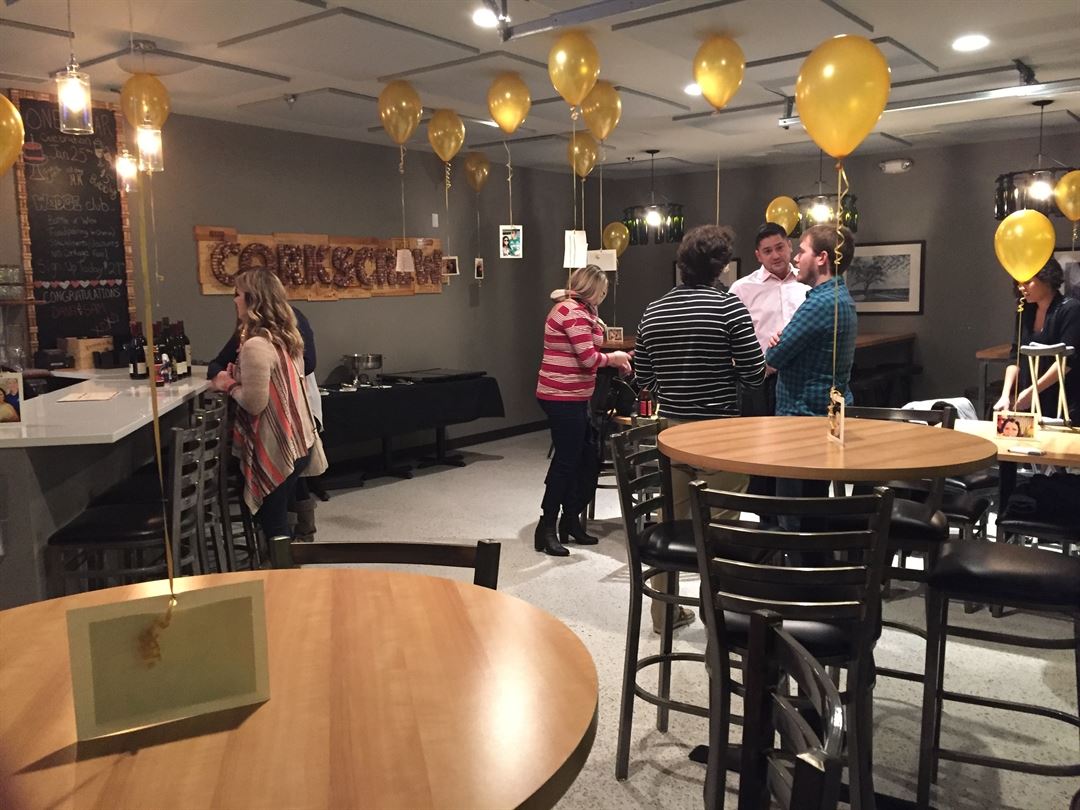 Our space can accommodate 125 plus people including the use of the patio space! Corkscrew's Party Room at the Blackstone Location accommodates groups of 65 plus persons for informal events and 50 for sit-down events. This space has glass garage doors that open to our patio add a distinctive and modern addition to our party room convenient mid-town location planning a once in a lifetime event such as wedding rehearsal dinner and wedding receptions! The space is also hosted for weekly meetings perfect for birthdays, bridal / baby showers, receptions, corporate events, holiday parties, surprise parties, networking events and fundraisers.