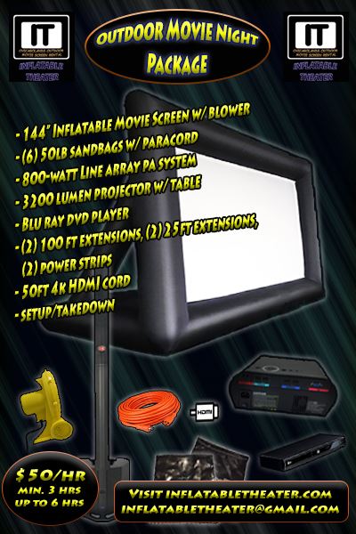 Everything you need for massive projection at home! Includes screen, blower, 800-watt line array sound system, (6) 50lb sandbags, 550 paracord, 3200 lumen projector w/ table, blu ray dvd player, (2) 100ft extensions, (2) 25ft extensions, (2) power strips, 50ft HDMI cord, and full setup and take down. Great for family movie nights, birthday parties, block parties, video game nights, weddings, and more!