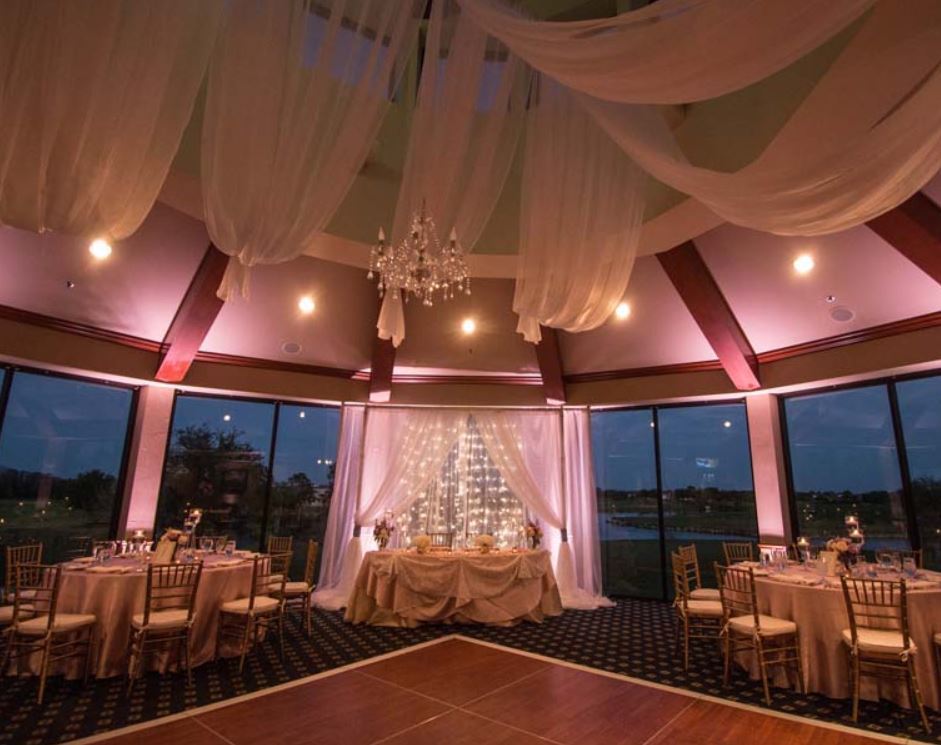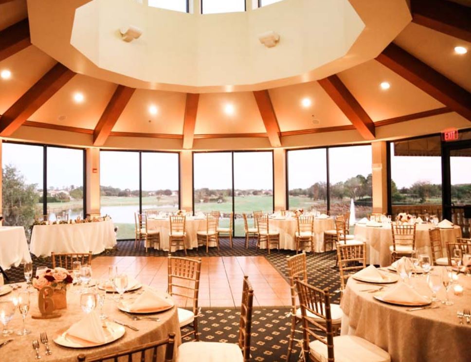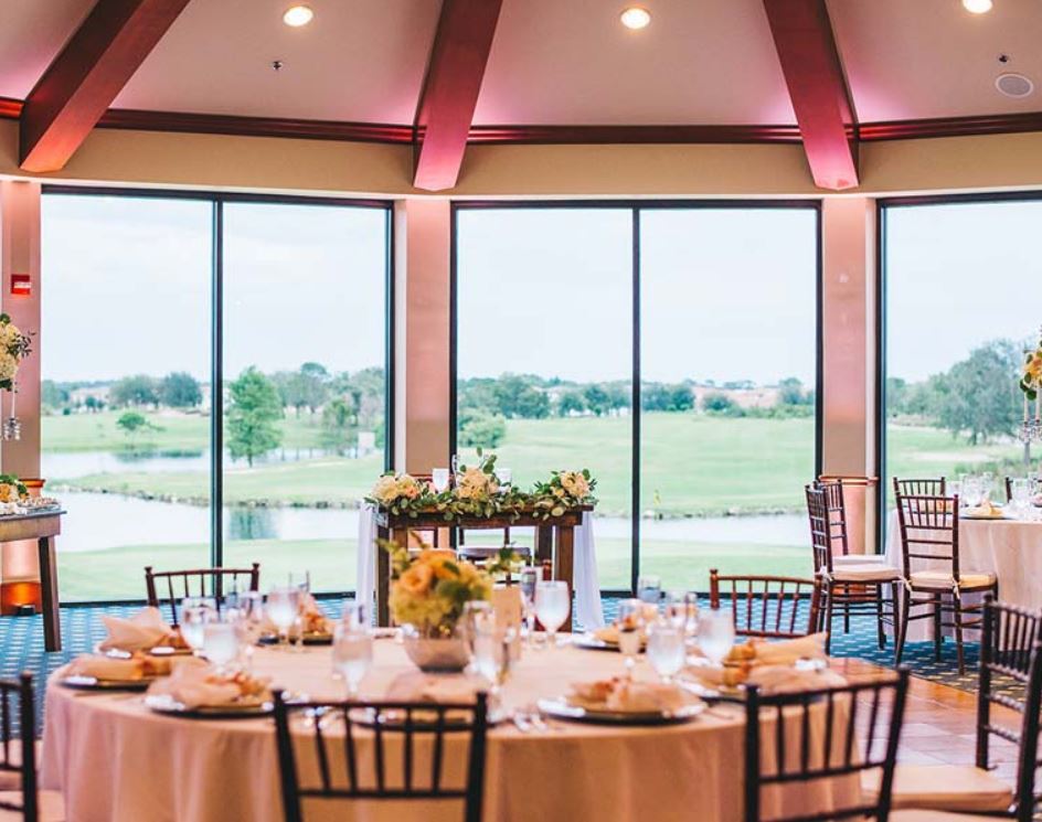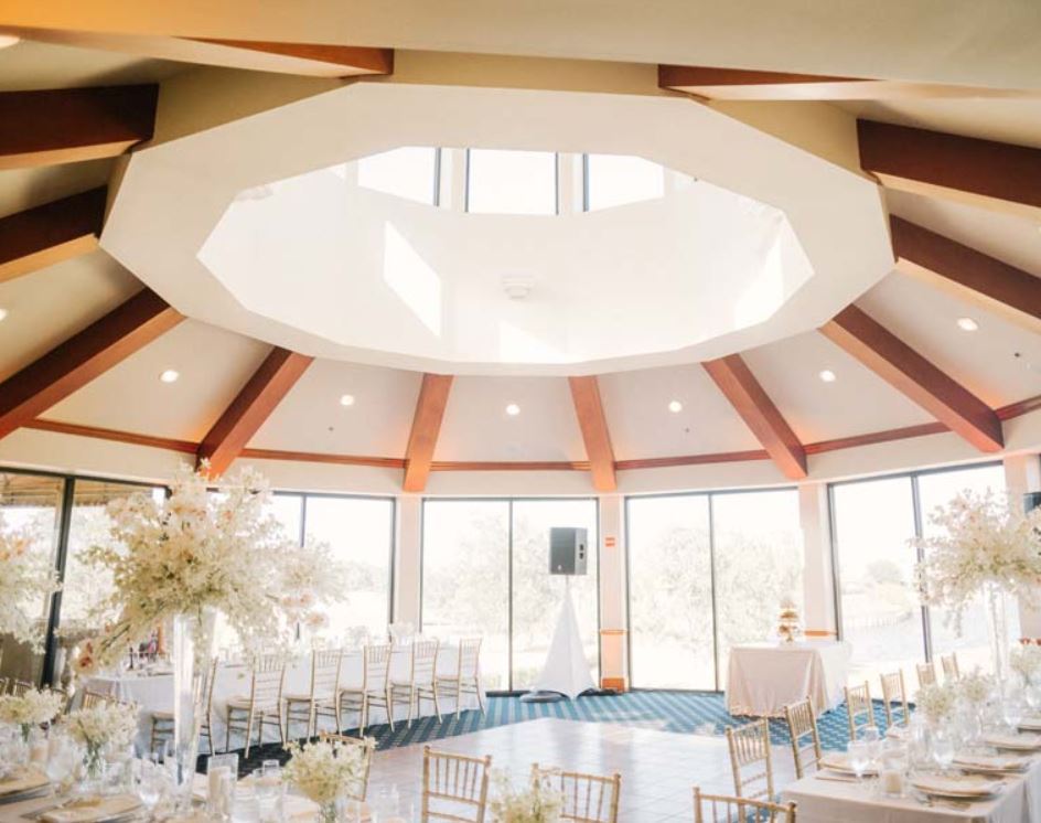 Eagle Creek Golf Club encompasses a feel of old-world romance from the moment you cross the cobblestone bridge. We offer both the ceremony and reception site here at Eagle Creek. Our reception facility is very unique in that it is a circular room with a sweeping panoramic view through our bay windows from the ceiling to the floor along with beautiful sky lights in the center atrium.