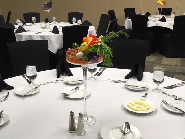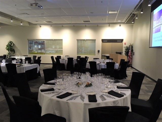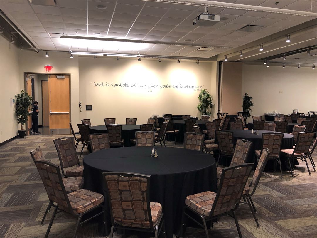 The Community Room offers 3,100 sq. feet to accommodate large or small meetings with a variety of room set-up and catering options and picture-window views of the food distribution center. The space accommodates 90 banquet style with round tables with 6 seats each. The use of our on-site catering service is required.