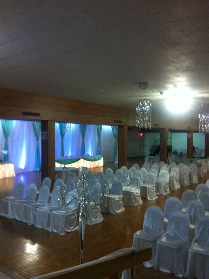 The Grand Ballroom, or otherwise referred to as the Main Hall or Large Hall, is a beautiful space fit for any occassion hosting many guests. It boasts hardwood floors and visible beams in the ceiling, giving it a rustic, natural atmosphere, while the crystal chandeliers create an ambiance of elegance.