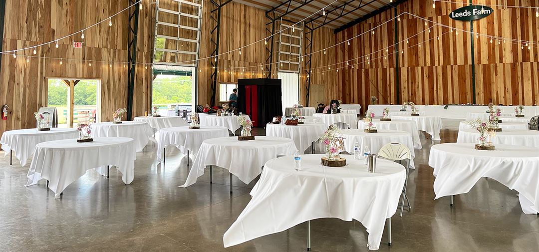 Leeds Farm provides the perfect rustic setting for your wedding with the modern amenities and comforts you desire. Our wedding venue overlooks 80 acres of rolling fields, picturesque pastures, and a spring-fed pond surrounded by a backdrop of native hardwood trees.