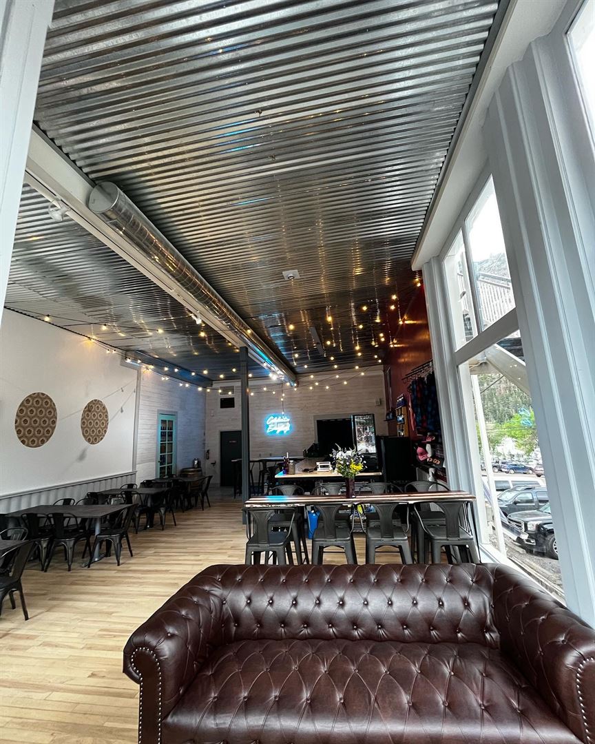 An intimate 652 sq.ft. offered for private events in the original Ouray mercantile building, the historical Wright Building. A small lounge area adorns the dining room with low top table seating and also bar top seating is offered. A large storefront with tall windows always has a view centered on the amphitheater. Historic decor adds to the western vibe of this unique space.
