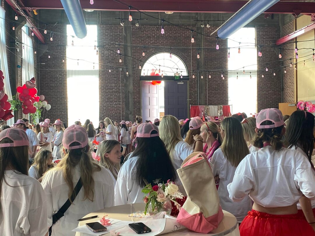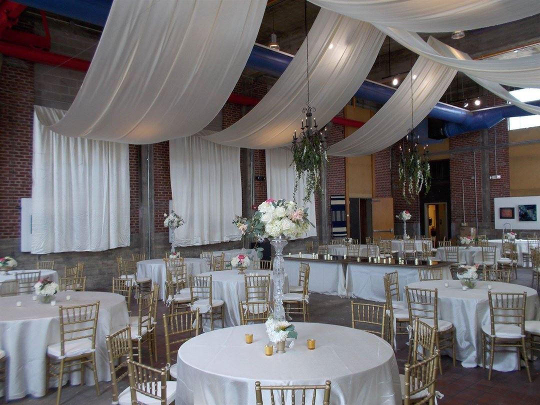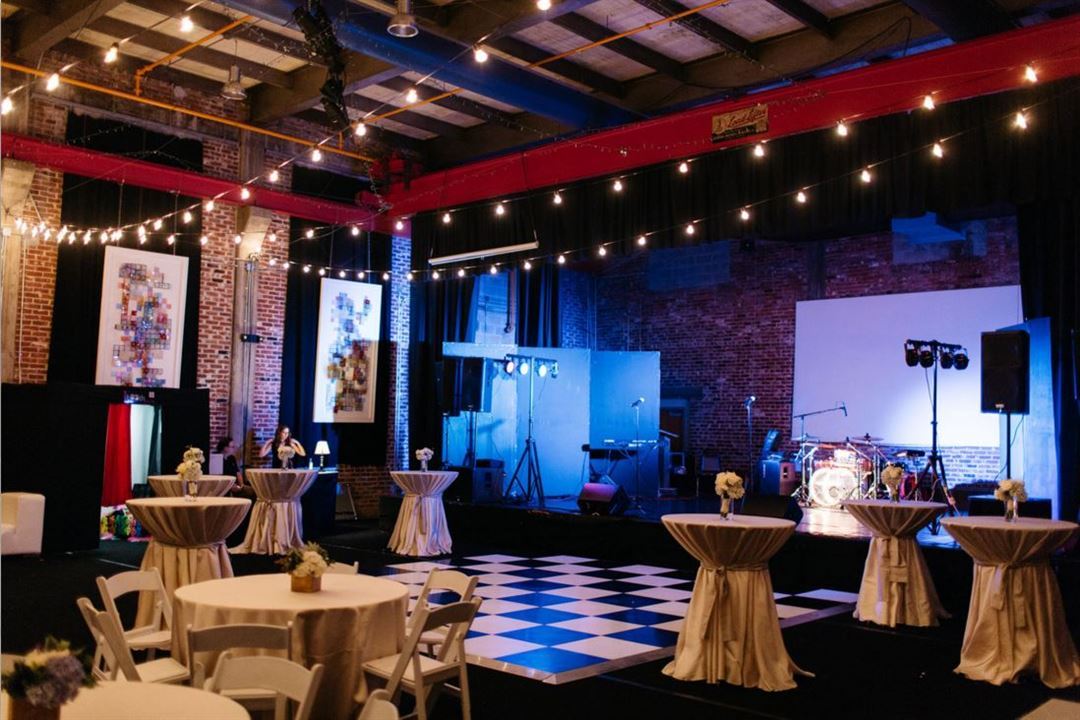 Both the Gallery and the Theatre are 40 feet by 60 feet and both have a ceiling height of 24 feet. We are able to hang decorations from the ceiling, such as chandeliers, paper lanterns, or flower arrangements. (Decorations are not provided.) The Theatre has a 24 by 20 stage that can be used for musicians or ceremonies. It also features dedicated power for musicians.