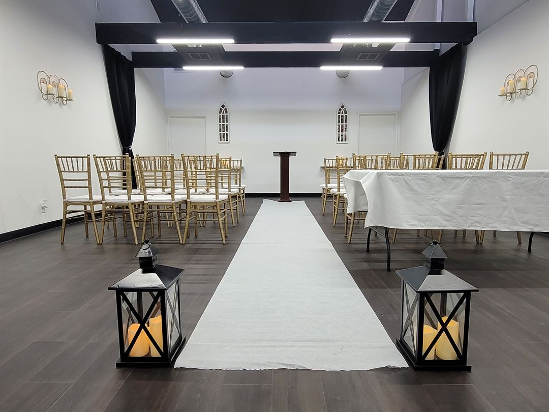 Welcome to the Today We Become One Chapel, where elegance meets contemporary design under a magnificent 22-foot vaulted ceiling. Adorned with a refined black, white, and gold theme, this exquisite space sets the stage for unforgettable ceremonies accommodating up to 80 guests.