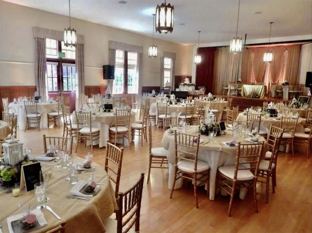 This warm, bright, historical house is perfect for weddings, birthday parties, meetings and other celebrations. Once you book our venue, we reserve the entire clubhouse just for you. All tables and chairs are included. The clubhouse features a baby grand piano, audio visual equipment, speaker lectern, WiFi and air-conditioning. Included in your rental are 180 banquet chairs and various table options.