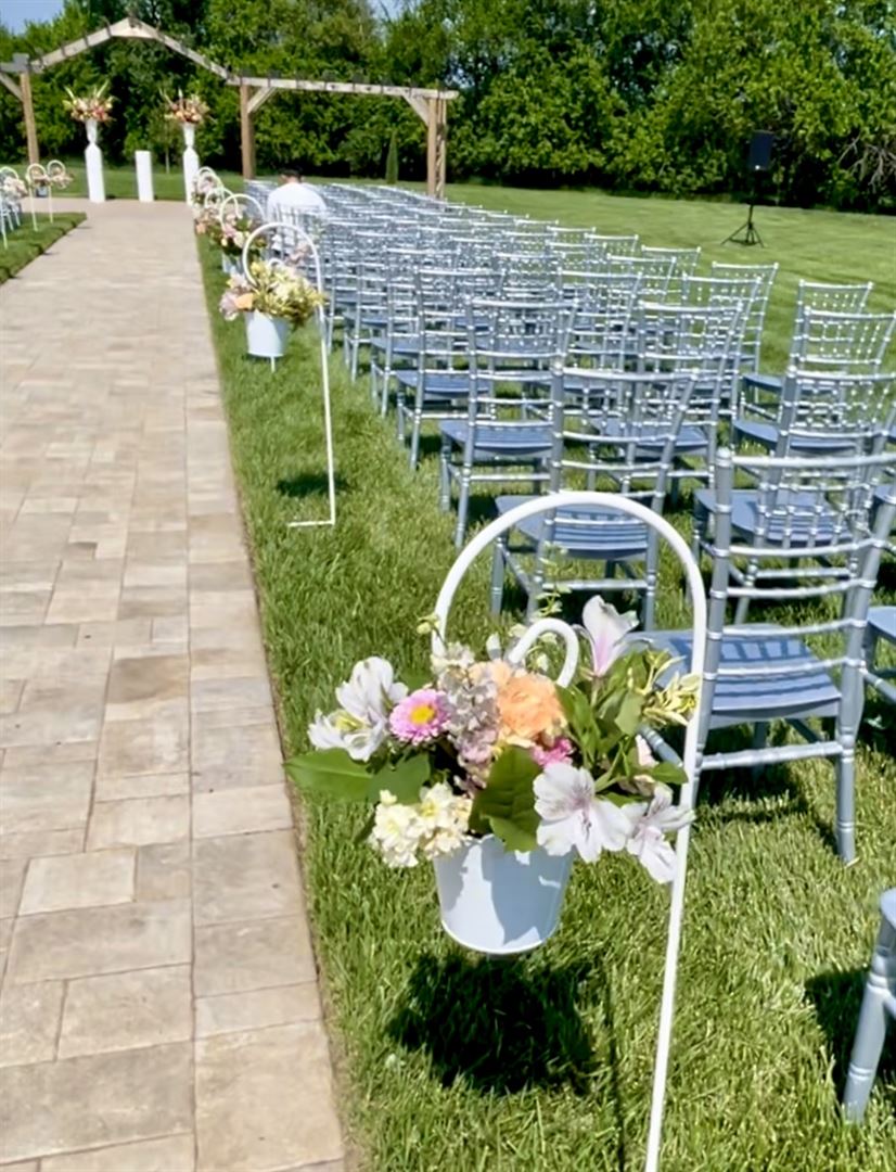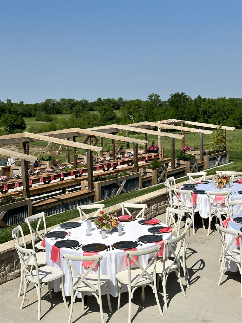 Tables-Round, Long Farm, cocktail. Chairs- X Back event space, Chiavari chairs in event meadow, benches. Tableware, flatware, chargers, glassware, specialty serve ware. Linens-in house: White, black and multiple color choices. Decor-in house: 5 inch square glass vases, lanterns, candle holders, JBL speakers, Color changing ceiling LED lights, and more.