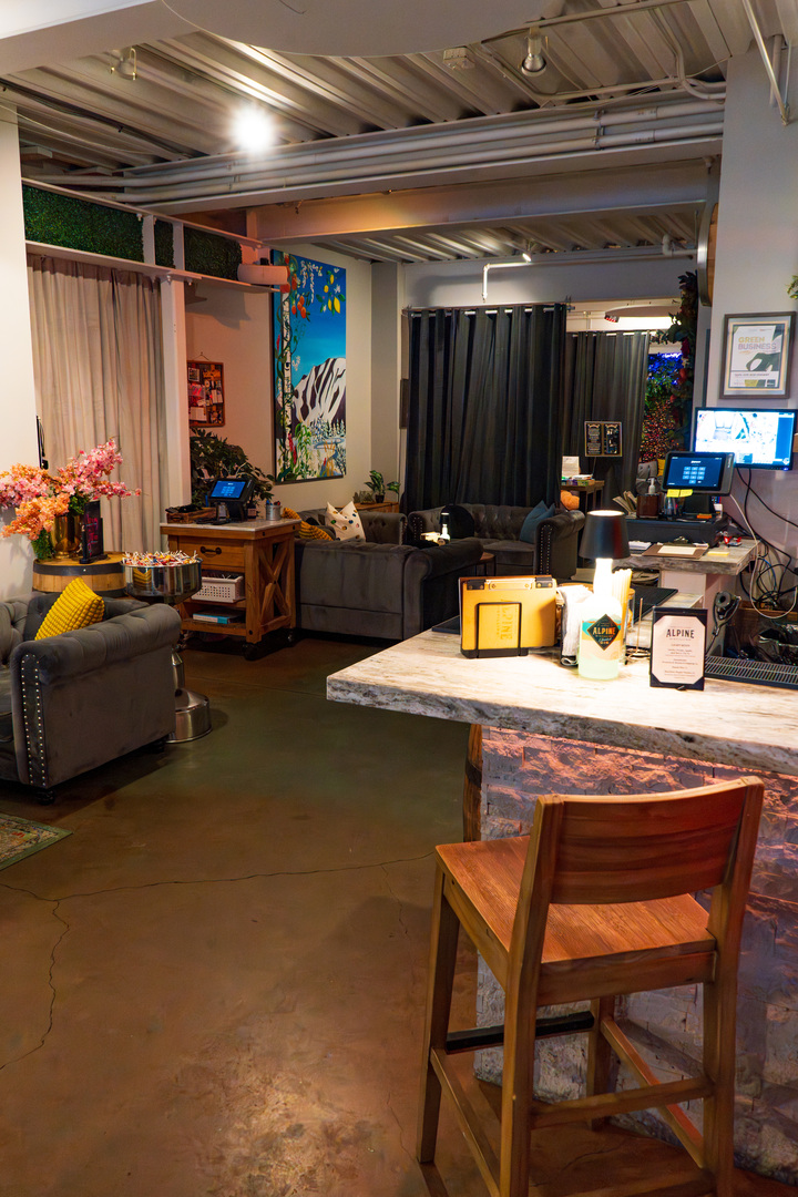 The spacious and chic modern subterranean tasting room boasts two entrances (one coming down from Main Street and the other with no steps on the corner of 4th Street and Swede Alley), a large focal-point bar, a mini distillery for small-group gin-making experiences, in-house catering; ample lounge and cocktail seating (60+); space for catering, a DJ or small band, adjustable lighting; house sound system (Spotify, Pandora, Tidal); multiple breakout or VIP spaces; optional coat check with attendants; a bottle and souvenir shop; AV solutions; and more. This incredible and versatile venue is available for semi-private and private parties of 8-60 and 60-125, respectively.