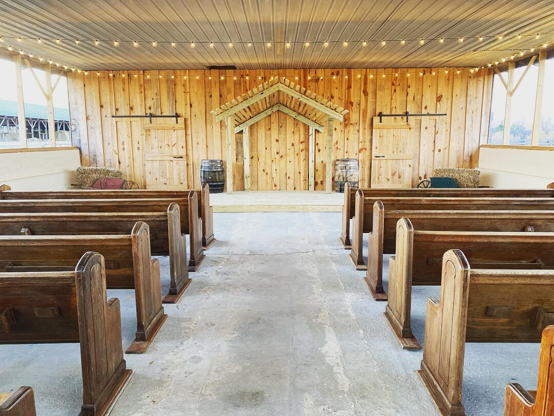 The main event barn was constructed using antique lumber reclaimed from the historic McGill home, built circa 1840 in Cumberland County, and from a cotton gin built around 1900 on a Gillis family homestead. That reclaimed material runs throughout the venue — the bar, the chapel arbor, the bridal suite's accent wall, the makeup counters, the half-round tables, and the window and door frames. It's not a manufactured rustic aesthetic. It's the real thing.