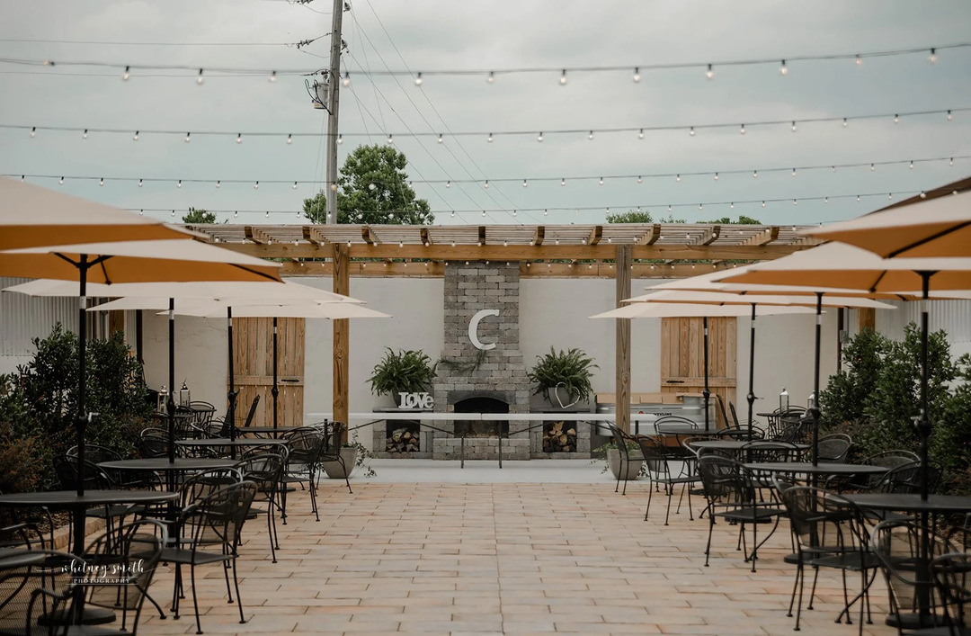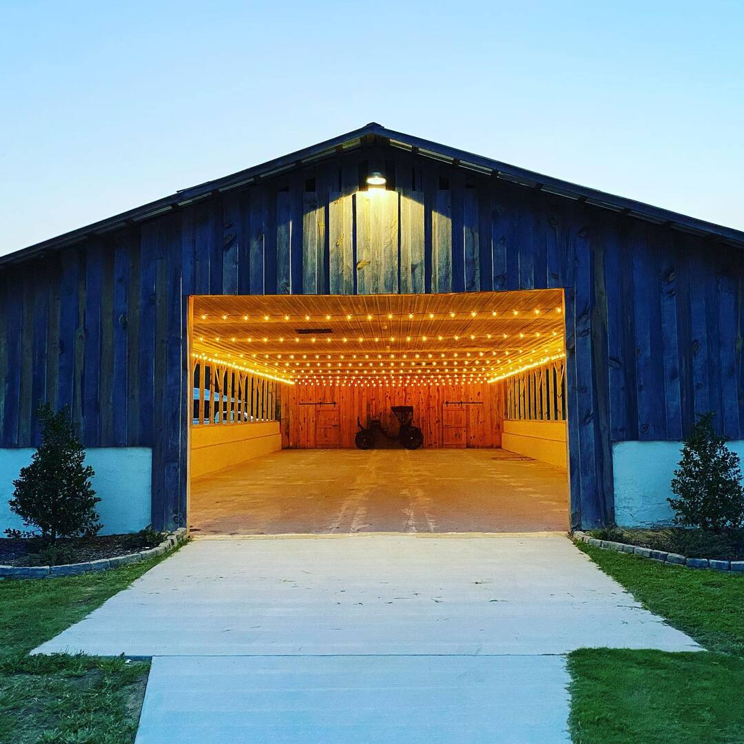 The property includes three distinct spaces: the main barn, the groom's barn with a nearly 3,000 square foot open-air covered shelter, and a 2,000 square foot courtyard with a fireplace under a pergola and string lights overhead. Your ceremony, cocktail hour, and reception each have their own space — or you can configure them however you want.